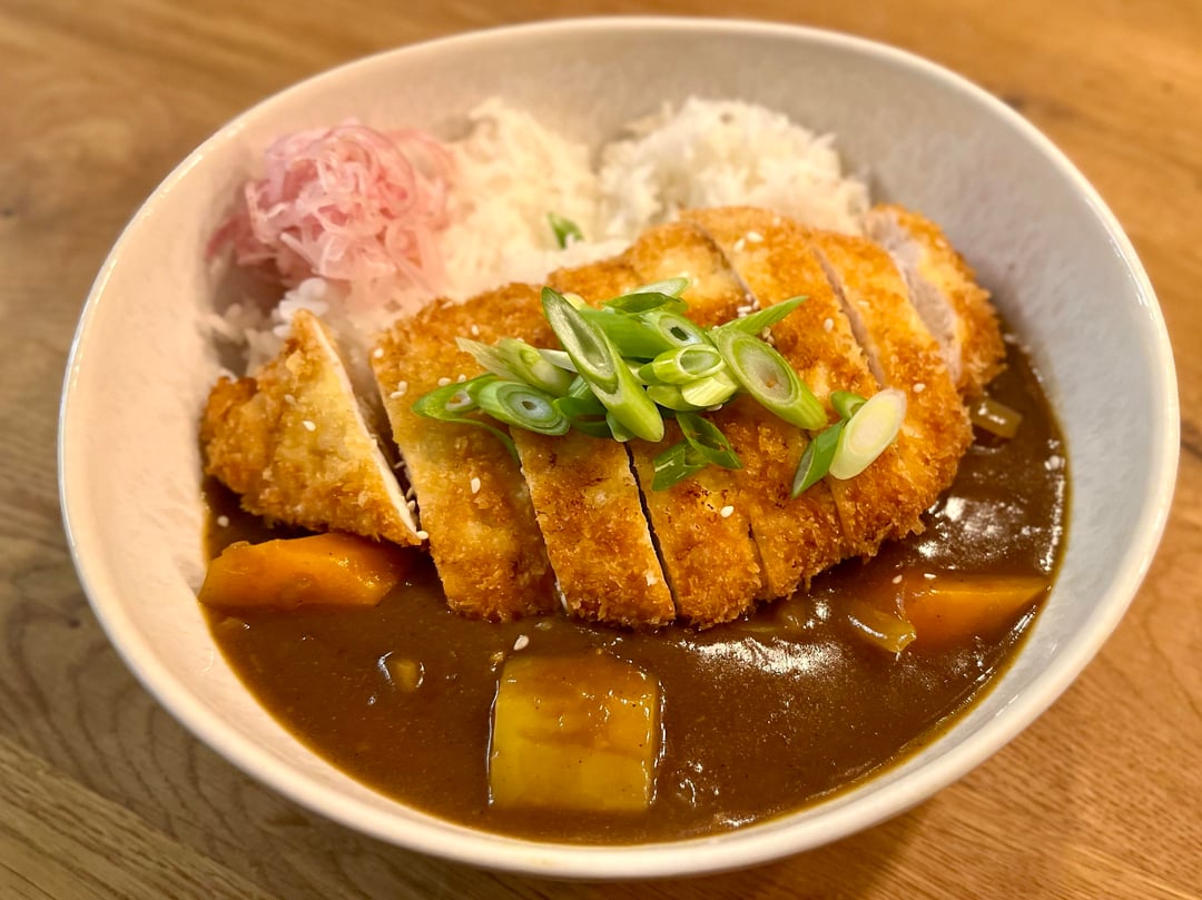 – Dazu Reis und und ein Hähnchenschnitzel mit Mehl, Ei, Pankomehl paniert. Garnieren mit Sesam, Frühlingszwiebeln und ich hatte noch eingelegte Schalotten im Kühlschrank.