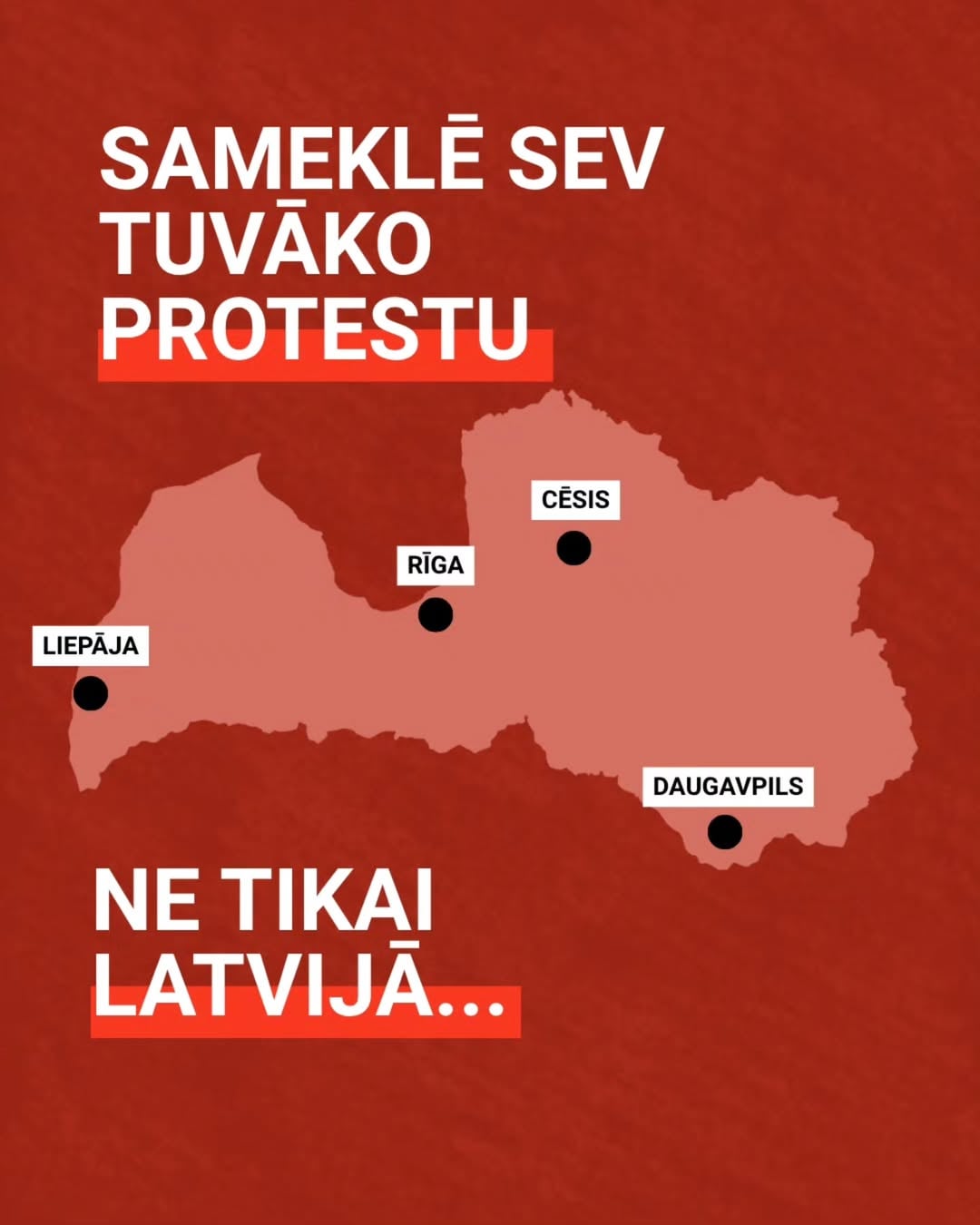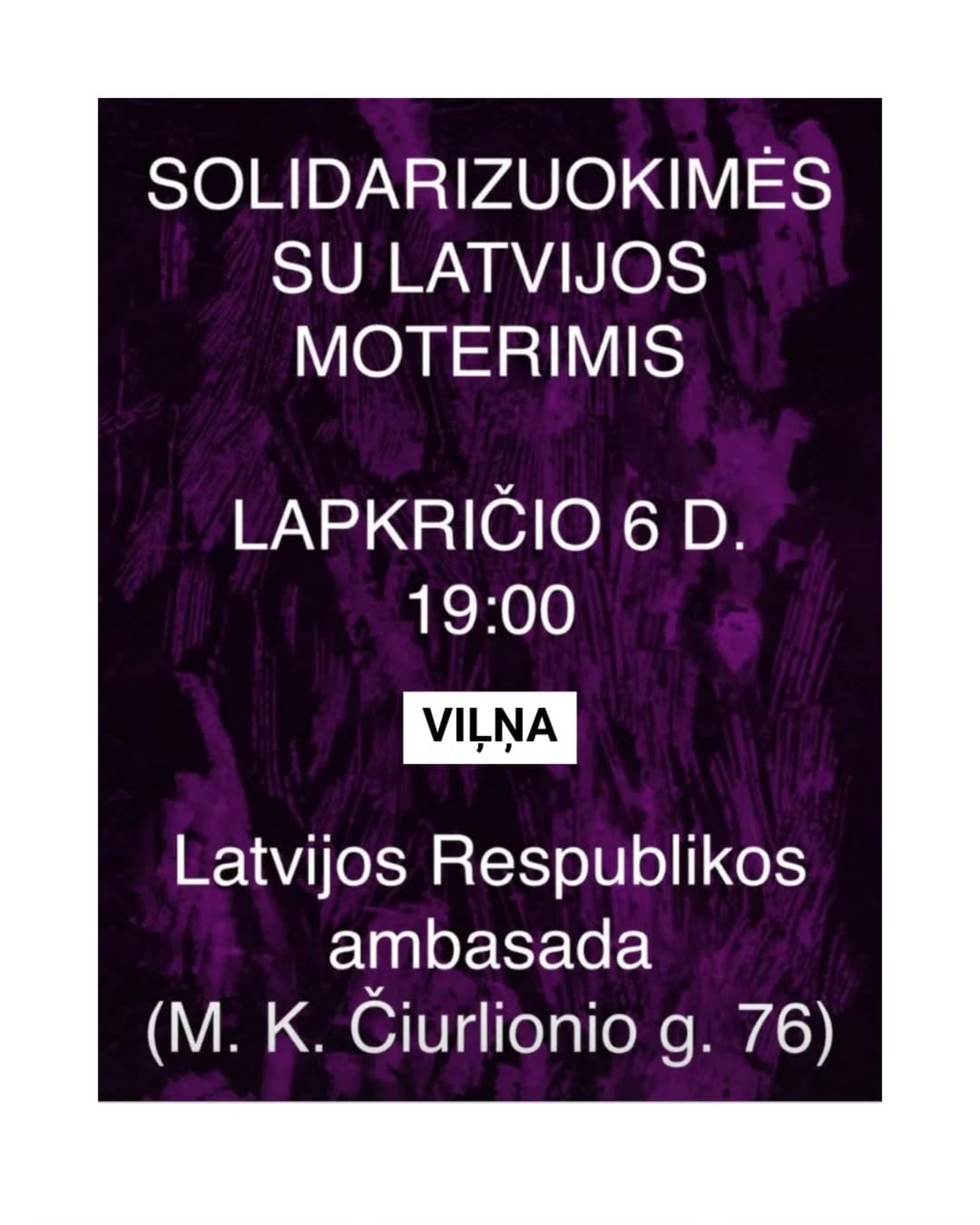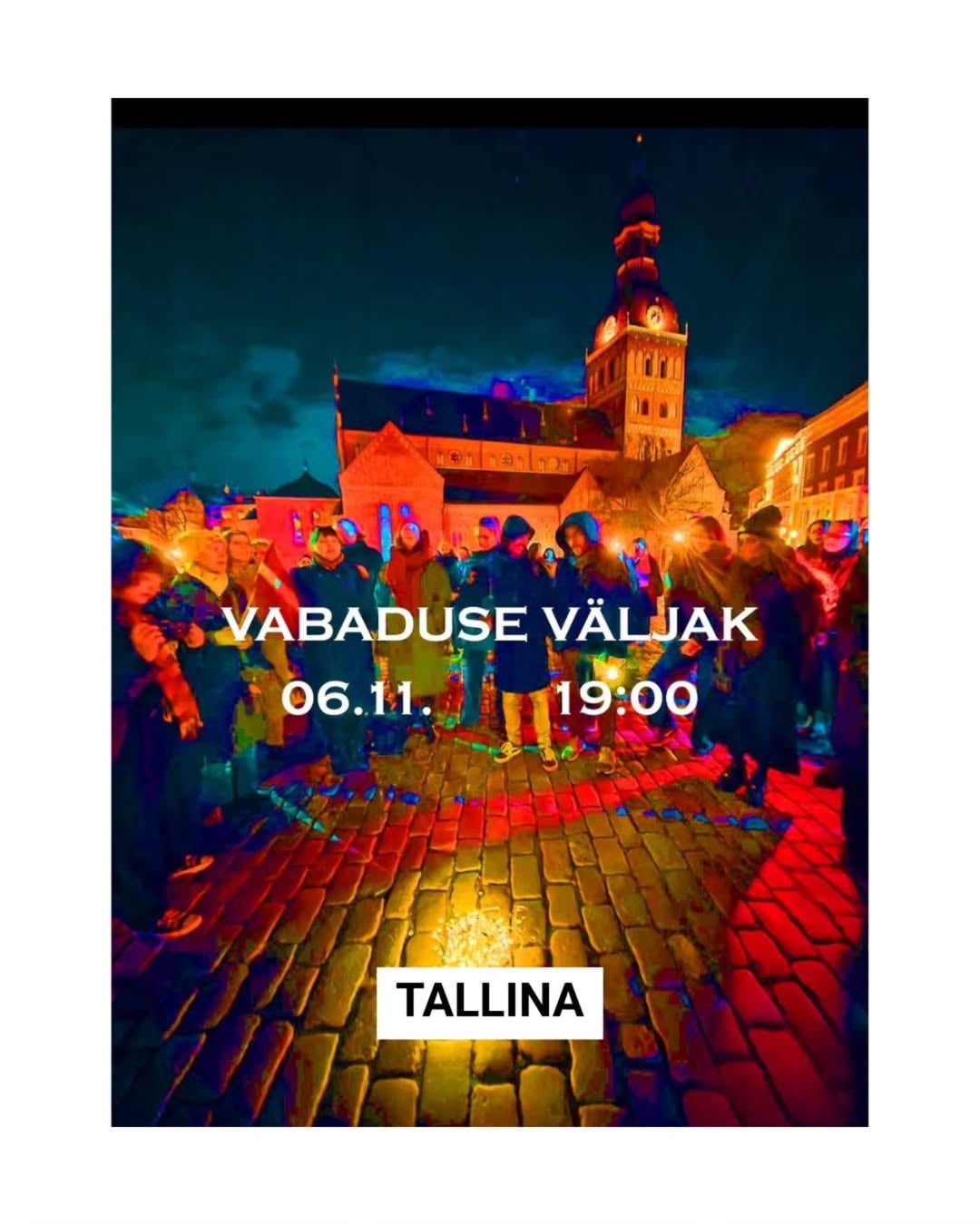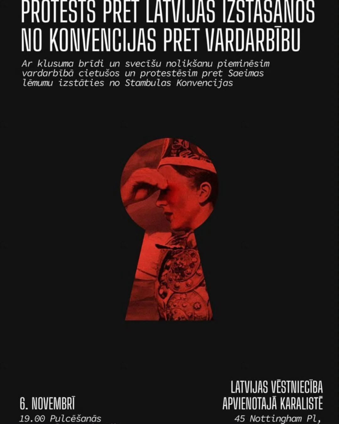 • Daugavpils – 6. November, 19.00 Uhr, Vienības-Platz • Liepāja – 6. November, 19.00 Uhr, J. Čakste-Platz, Alejas iela 15 • Cēsis 6. November, 19.00 Uhr, Rožu-Platz • Vilnius – 6. November, 19.00 Uhr, LR-Botschaft in Litauen • Tallinn, 6. November, 18.00 Uhr, Vabaduse väljak 9 • Tartu, 6. November, 19.00 Uhr, Tartu Raekoja plats • London 6. November, 19.00, LR-Botschaft im Vereinigten Königreich • Stockholm, 6. November, 18.00, LR-Botschaft in Schweden • Brüssel, 6. November, 18.00, LR-Botschaft in Belgien • Wien, 6. November, 18.00, LR-Botschaft in Österreich • Berlin, 6. November 18.00 Uhr, LR-Botschaft in Deutschland • Den Haag, 6. November, 18.00 Uhr, Friedenspalast, Carnegieplein 2 • Oslo, 6. November, 18.00 Uhr, LR-Botschaft in Norwegen • Madrid, 6. November, 18.00 Uhr, LR-Botschaft in Spanien