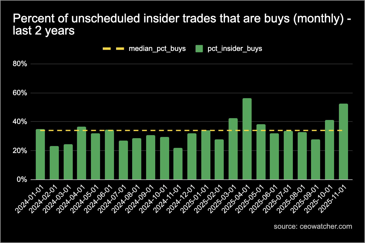 Insider kauften im April eine Menge Aktien, nachdem Trump mit seinen Zöllen den Markt zum Absturz gebracht hatte (und diese Insider schnitten recht gut ab). Überraschenderweise war der Oktober der zweitbeste Monat für Insiderhandel seit mindestens zwei Jahren.