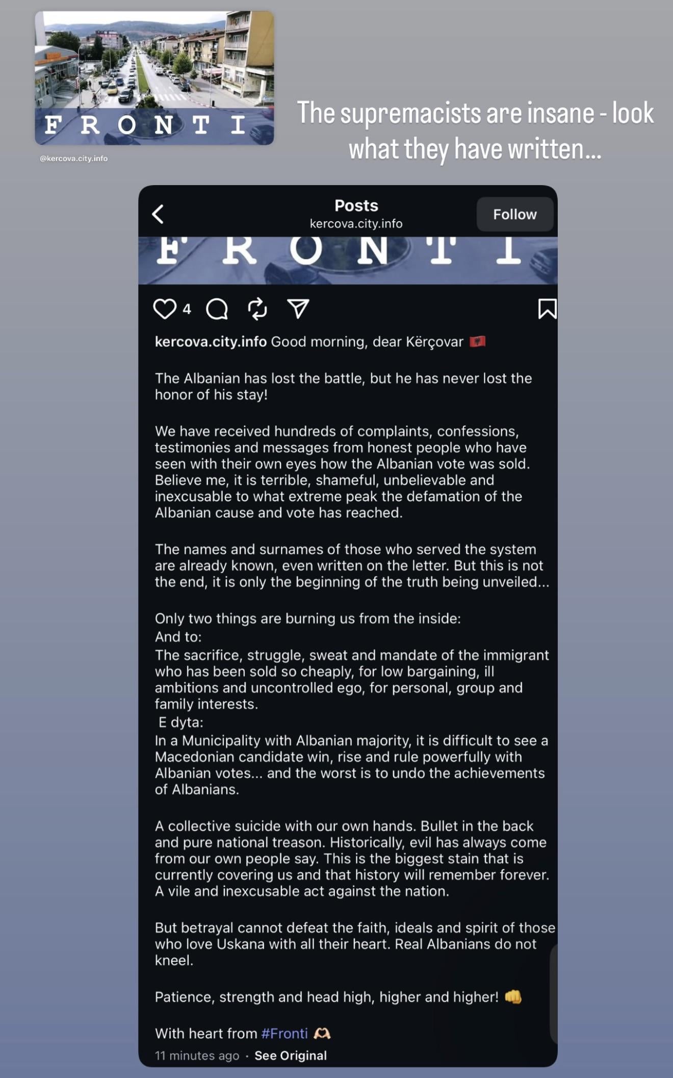Градот Кичево има само 20% албанци…не знам зошто го мислат Кичево за “нивен”. Па и Скопје го викаат нивен така да не треба да сум зачуден.