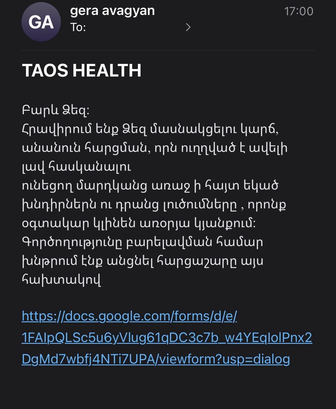 Heute, am 4. November, erhielt ich eine E-Mail von jemandem namens Gera Avagyan, offenbar einem Arzt, im Namen eines armenischen KI-Unternehmens namens TAOS HEALTH, das sich auf die Unterstützung von Versicherungsunternehmen konzentriert.