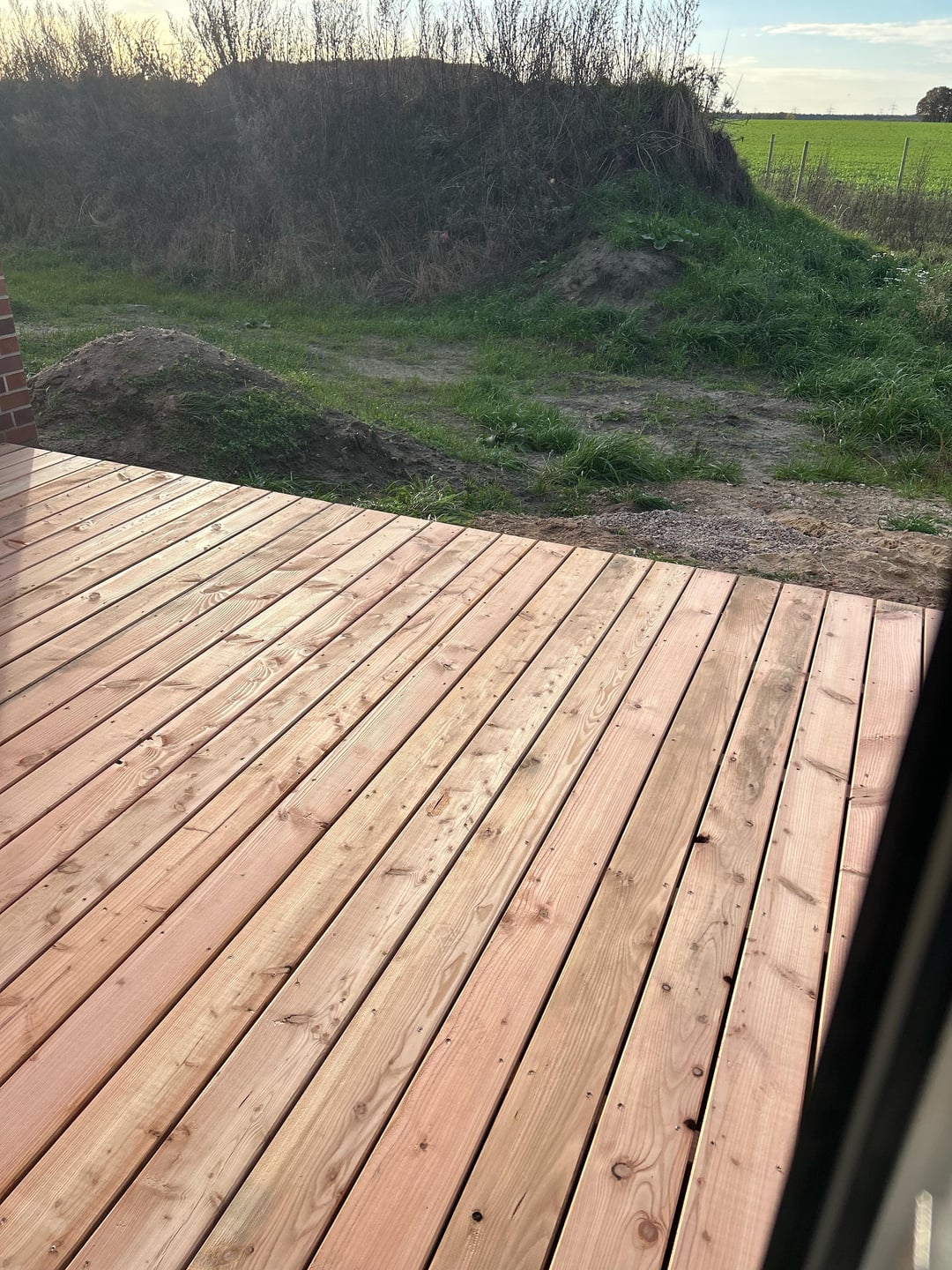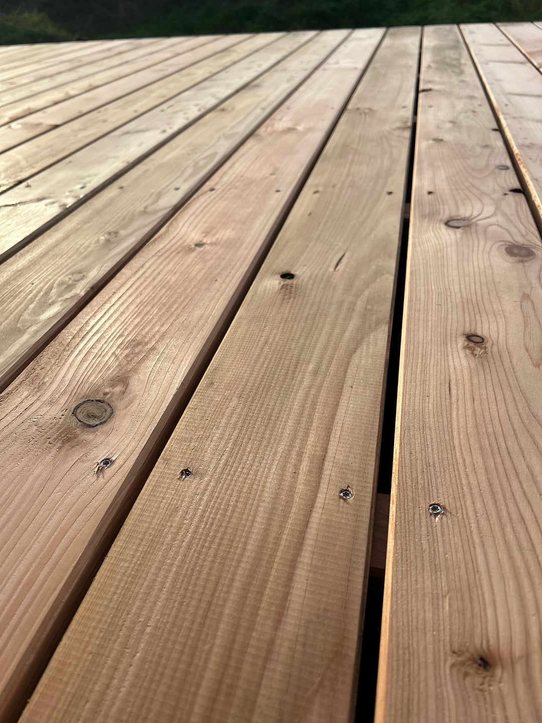 Gibts n Stirnseitiges Foto? da könnte man evtl besser erkennen ob die bereits versiegelt wurden. Und sieht für mich stark nach falschen Schrauben aus. Und dass die Bretter nicht geriffelt sind zeugt auch nicht wirklich von nem Profi als Handwerker.