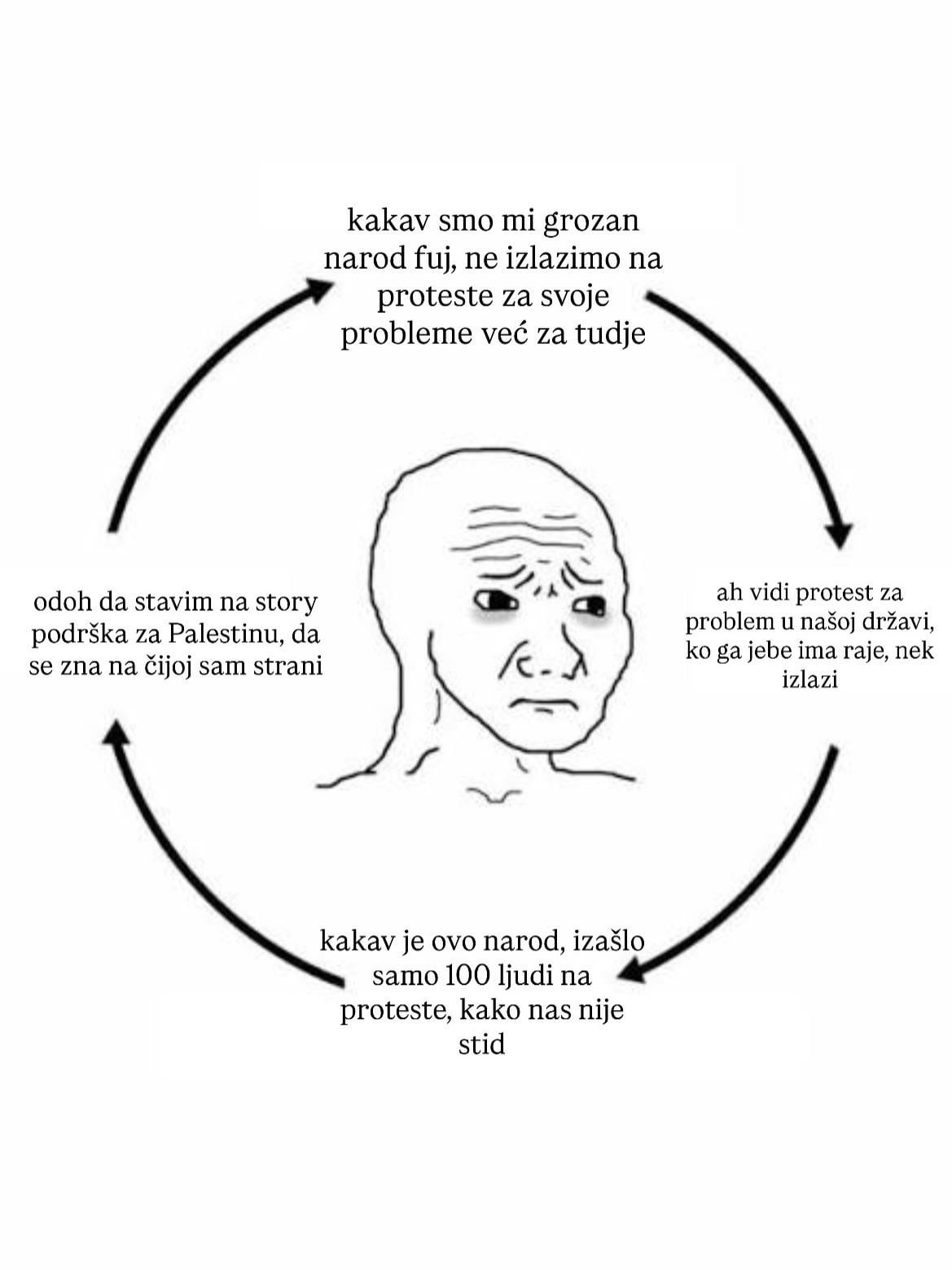 Podržajemo Palestinu, protestujemo, okupljamo se za tu nažalost teško pogođenu drzavi, sve to stoji lijepo treba naravno iako ne mozemo nista pomoć, al brate moj koje ignorisanje Bosne i Hercegovine, kad nas naša država treba, kad ne znam ni sam sta ne ne mi okrenemo leđa i ide ona famazna i nikad prevaziđena ‘Dobro je ovo sve, samo nek se ne puca’🫡