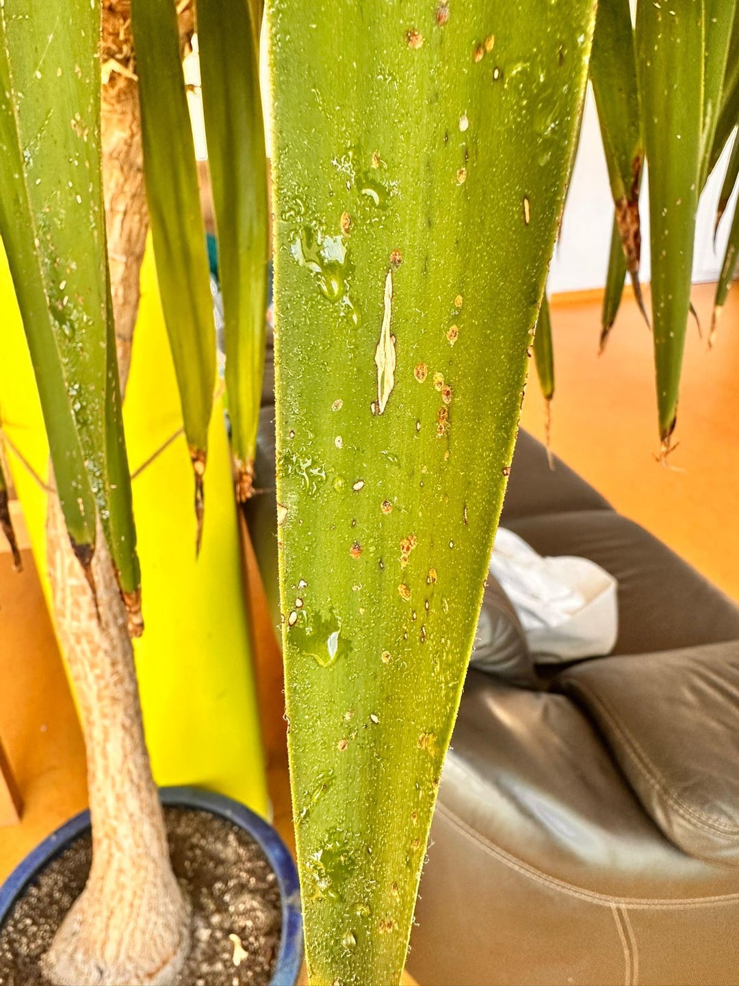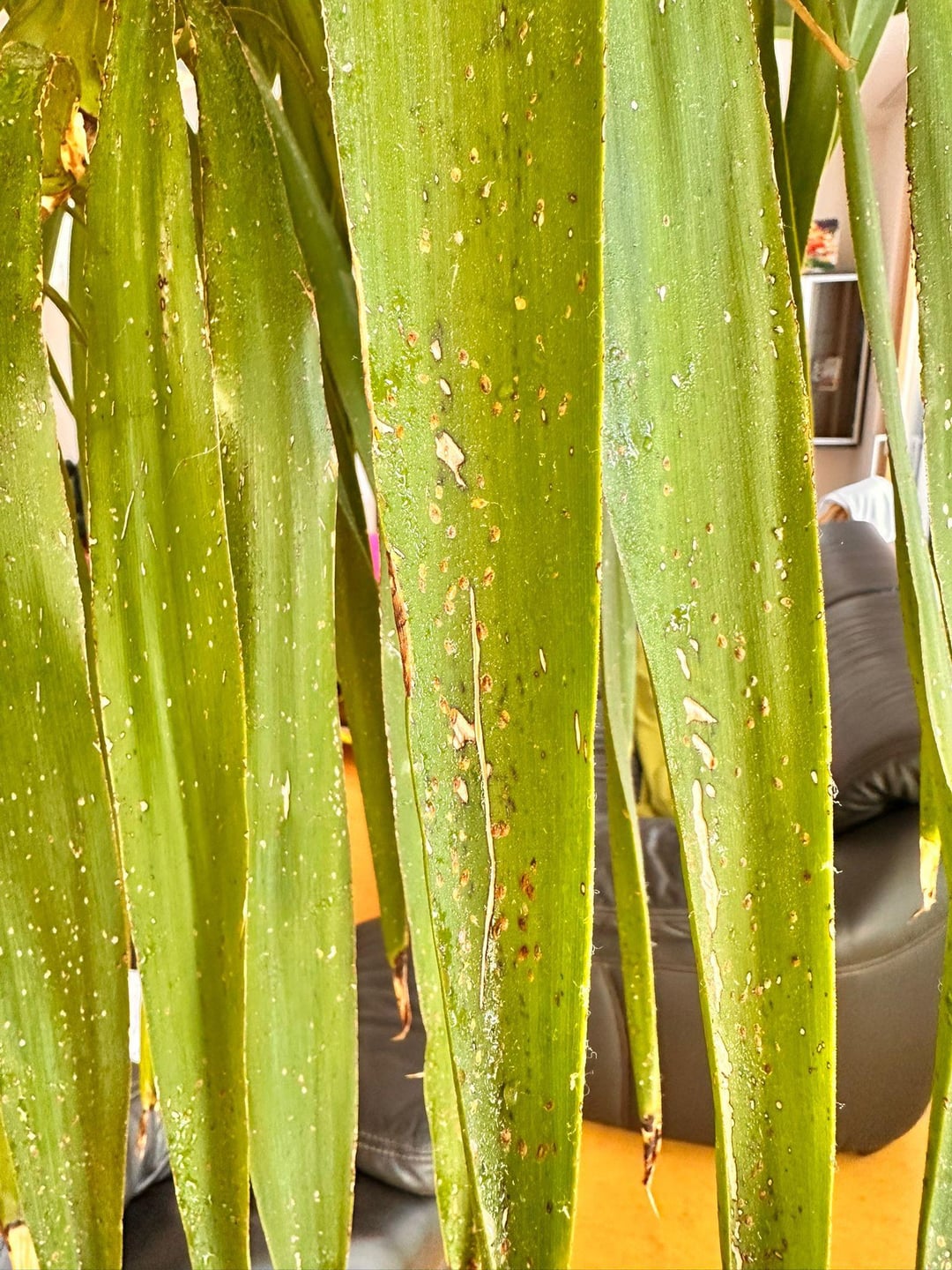 Die Palme auf der Gruppe meiner Arbeitskollegin sondert viel klebrige Flüssigkeit ab und hat braune Stellen. Was fehlt ihr? Von kaguma_
