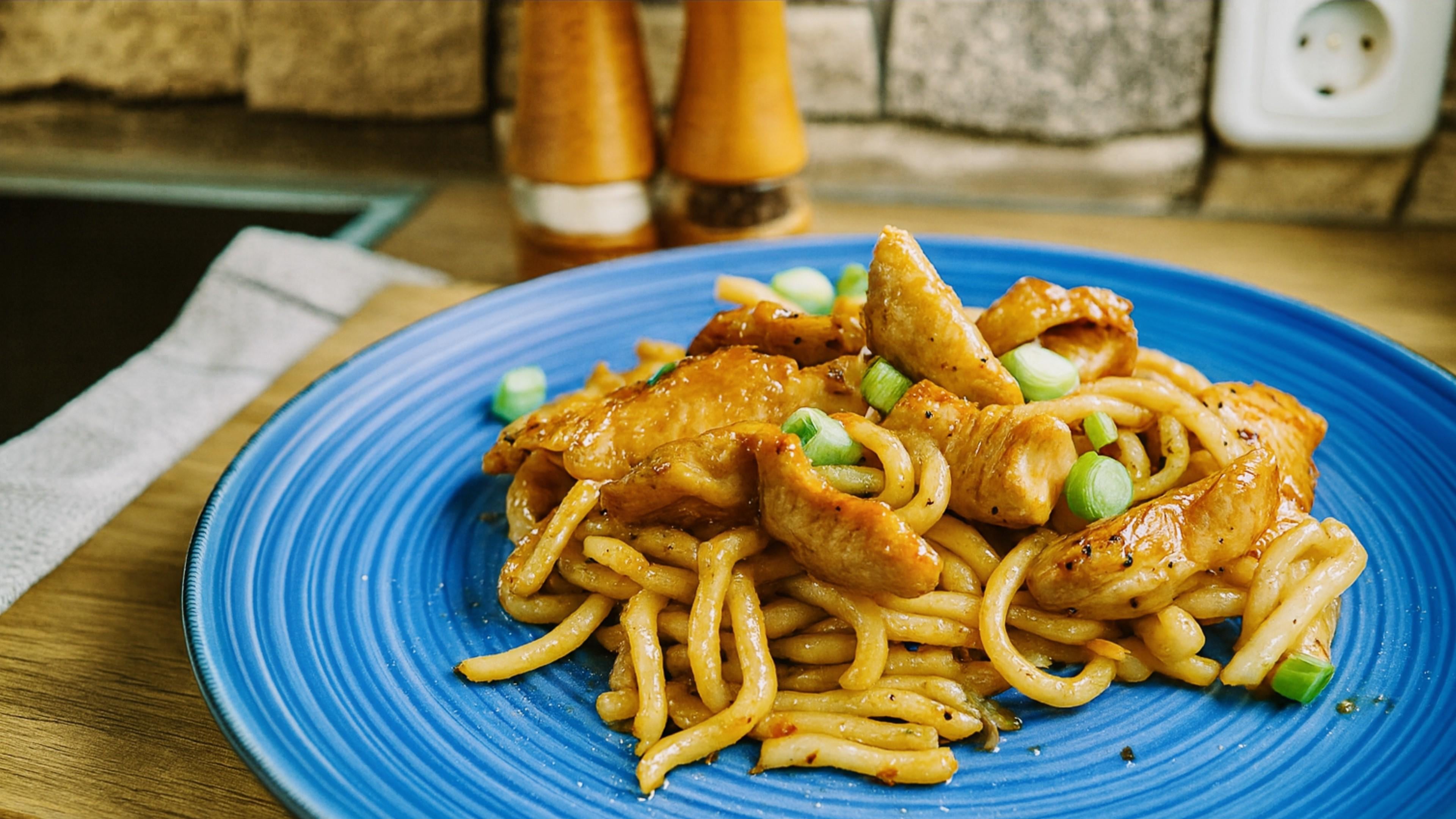 7. Udon Nudeln dazu, mit dem Chicken servieren.