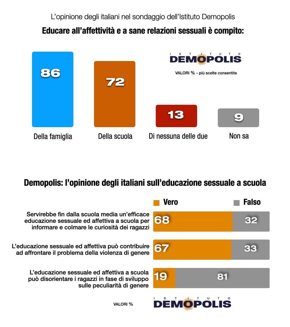 70 % der Italiener glauben, dass dies eine notwendige Entscheidung ist. Bei den Frauen liegt die Zustimmung bei über 80 %, während die Zustimmung bei den Männern mit 58 % geringer ausfällt. Mehr als 2 von 3 Bürgern befürworten sexuelle Aufklärung in der Schule für Jugendliche
