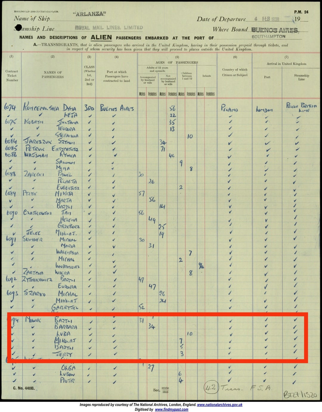 Die Eltern meines Großvaters mütterlicherseits (Weißrussen): Bazyli Nowik und Barbara (oder Warka) Nikolaichik kamen 1938 an Bord der RMS Arlanza mit vier ihrer Kinder nach Paraguay: Luba, Bazyli, Mikolaj und Jerzy.