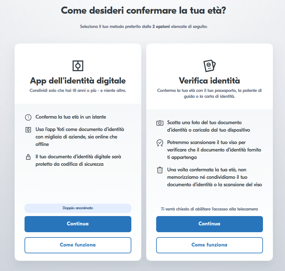 Pornhub ist zum Zeitpunkt des Schreibens noch aktiv, Chaturbate erfordert stattdessen den Zugriff über Yoti (keine SPID, wie wir bereits wussten), was im ersten Fall die Installation einer App oder das Senden eines Fotos eines Dokuments erfordert.