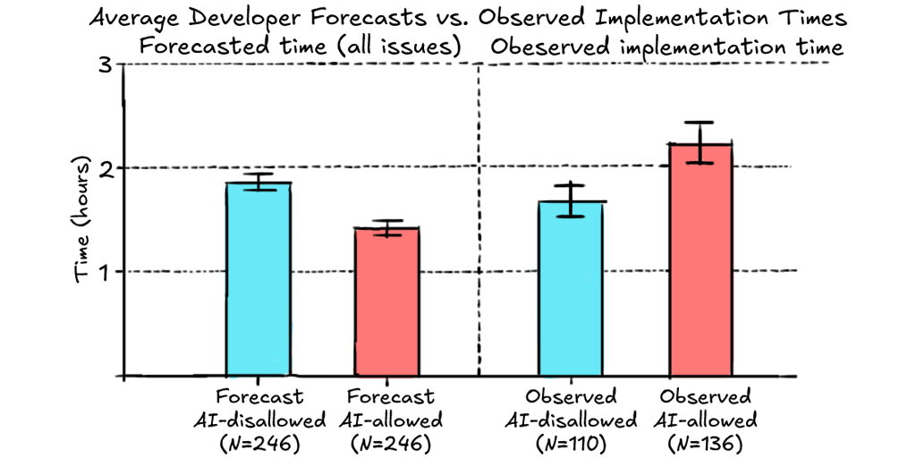 Untersuchungen zeigen, dass der Einsatz künstlicher Intelligenz beim Codieren die Entwicklung um 19 % verlangsamt. Dies liegt daran, dass Senioren länger brauchen, um den Code zu überprüfen. Es ist, als würde man einem übermütigen Junior folgen. Es ist nicht die Studie, die die wenig wundersame Natur des Einsatzes künstlicher Intelligenz in der Arbeitsweise hervorhebt. Bisher liegen uns keine Daten vor, die eine echte „Produktivitätssteigerung“ bestätigen.