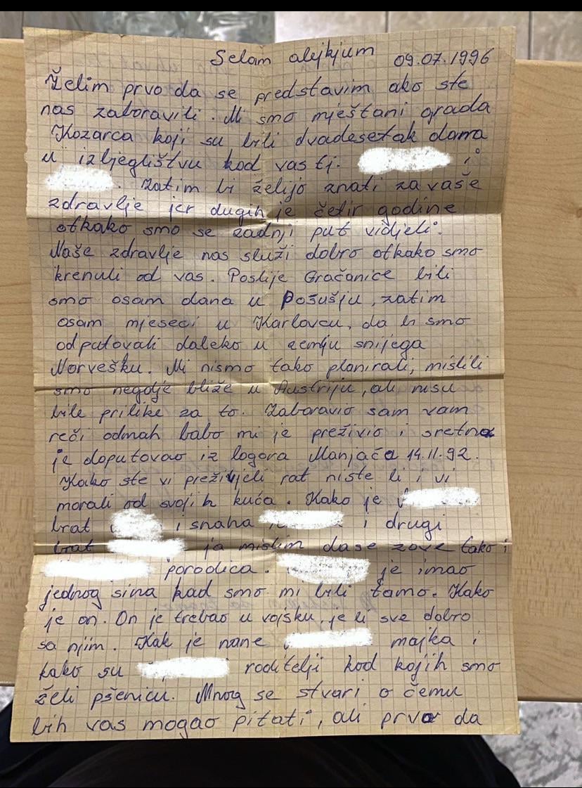 Ein kleines Stück Kriegsgeschichte, ein Brief von Flüchtlingen aus Norwegen in den neunziger Jahren. Kein Nachname, aber vielleicht erkennt jemand Namen oder Handschrift. Ich habe die Namen aus Datenschutzgründen unkenntlich gemacht, aber wenn jemand Informationen hat oder mehr wissen möchte, kontaktieren Sie mich bitte per PN.