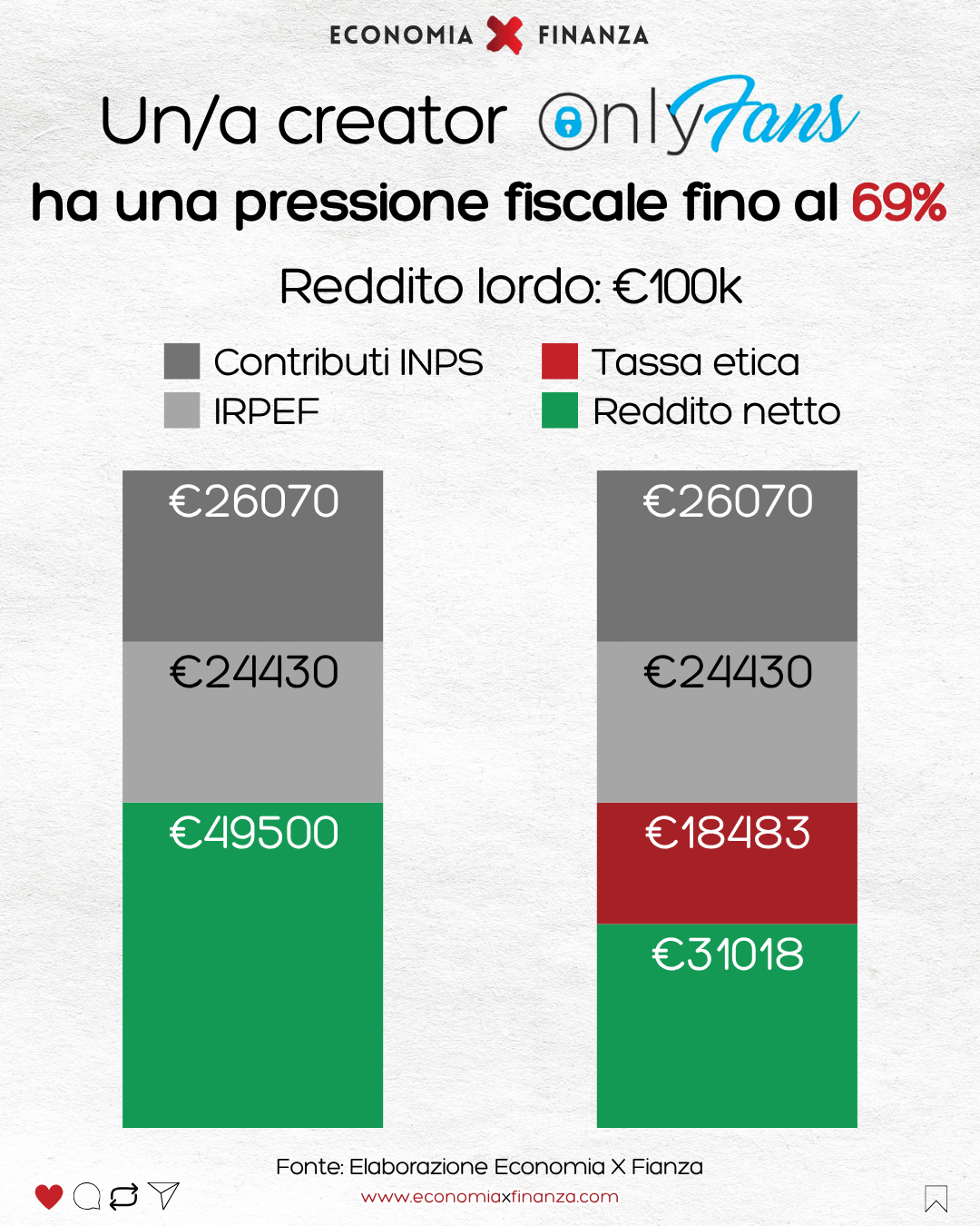 Bei der Ethiksteuer handelt es sich um eine zusätzliche Abgabe von 25 %, die zusätzlich zu den IRPEF- und INPS-Beiträgen für diejenigen erhoben wird, die legitime erotische Aktivitäten ausüben (OnlyFans, Cam usw.). Ergebnis: Von 100.000 Euro Bruttoeinkommen bleiben nach der vollständigen Bezahlung noch rund 31.000 Euro Netto übrig.