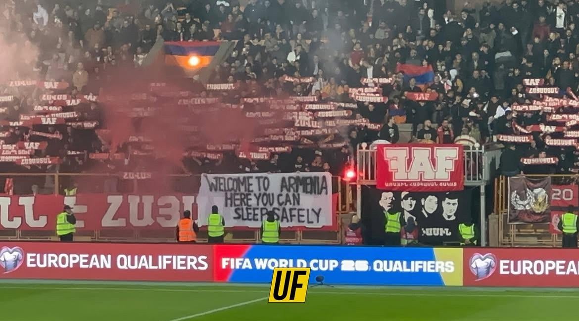 Gemeint ist das tragische Ereignis im Februar 2004, als der armenische Offizier Gurgen Margaryan während eines NATO-Seminars in Budapest ermordet wurde. Sein Mörder wurde später von Ungarn freigelassen und in Aserbaidschan gefeiert. Beim heutigen Spiel erinnerten armenische Fans die Welt an diese Ungerechtigkeit, indem sie ein Transparent mit der Aufschrift „Willkommen in Armenien, hier können Sie sicher schlafen“ zeigten.