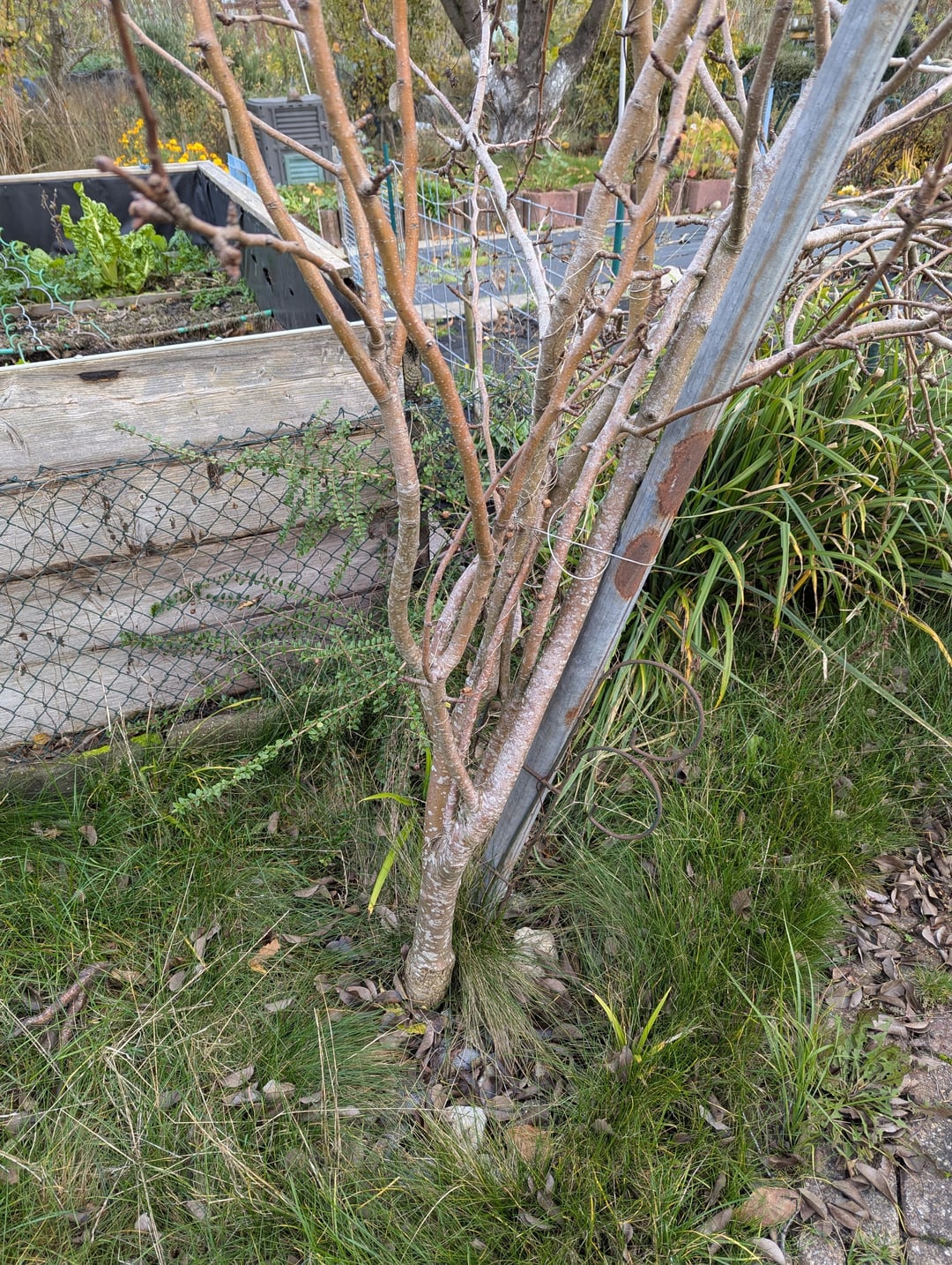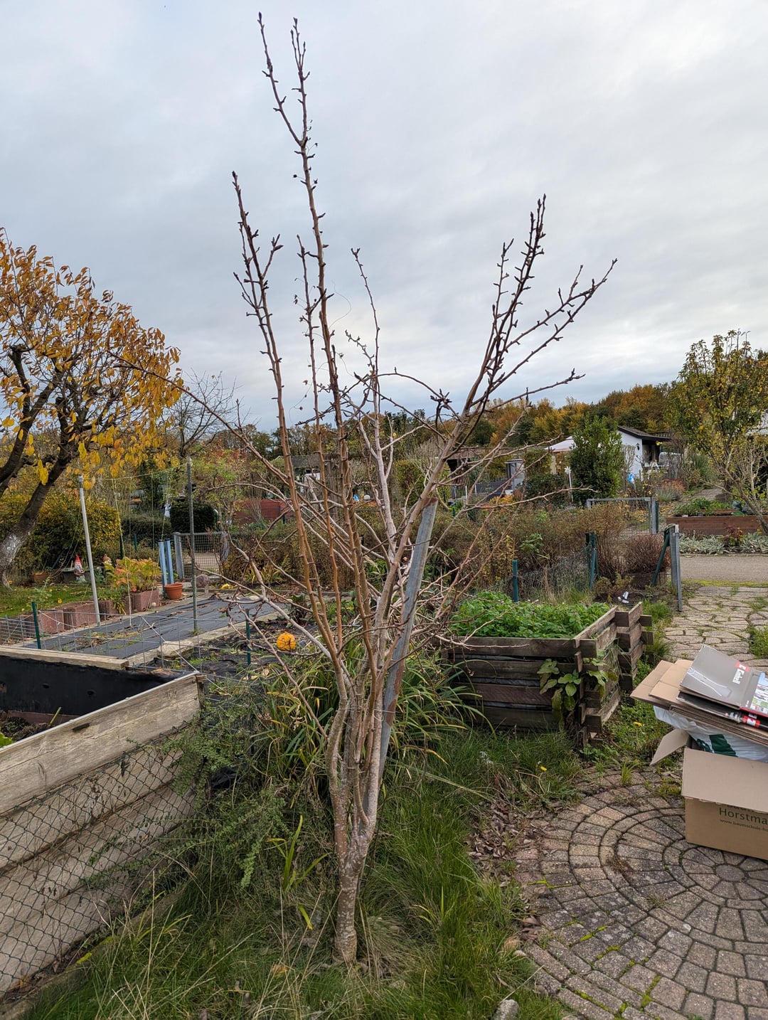 Ich würde keinen Baum Ende Herbst schneiden. Schlechte Wundheilung und im Früher kommen mehr Triebe. Schneid ihn nächstes Jahr nach der Ernte