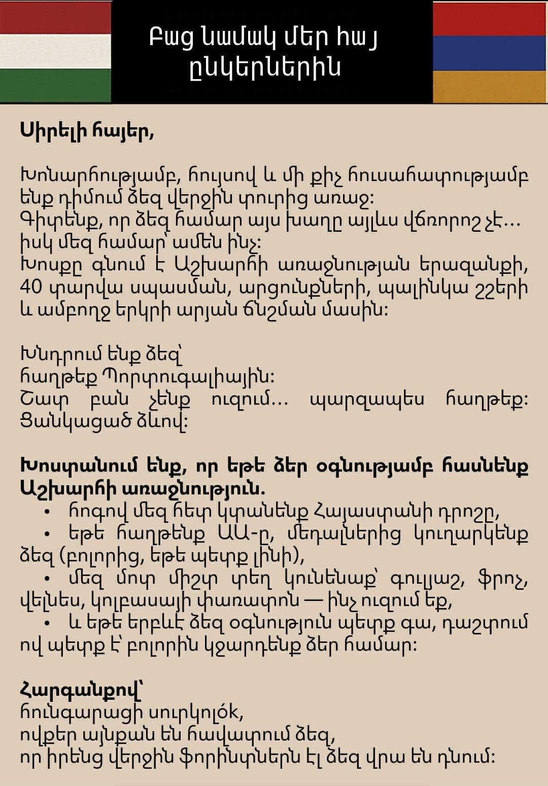 Liebe Armenier, wir möchten dies aus Ungarn aufrichtig mit Ihnen teilen. Wir wünschen Ihnen als Nation und als Kultur alles Gute. Wir hoffen wirklich, dass Sie alle Ihre Ziele und Wünsche erreichen, auch wenn wir davon überhaupt keinen Nutzen haben. Wir wünschen Ihnen bei allem Respekt alles Gute, jemand aus Ungarn.