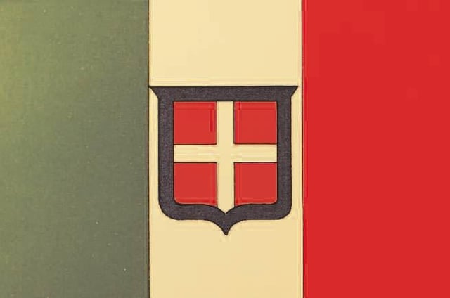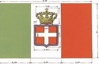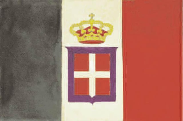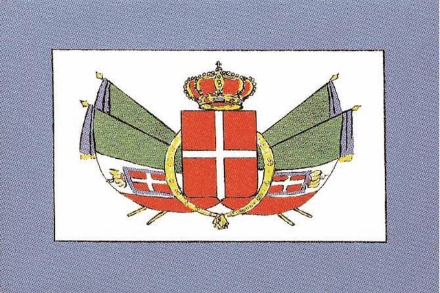 Pochi giorni dopo la resa e l’esilio dei Borbone, il 17 marzo 1861, la Legge n. 1 fissa l’inizio del nuovo Stato col nome di “Regno d’Italia”. La bandiera nazionale porta lo stemma sabaudo col bordo azzurro: nelle sedi e circostanze reali appare la corona dei Savoia sopra lo stemma, assente invece nelle bandiere mercantili come quella disegnata dagli acquerellisti della Treccani per la prima enciclopedia italiana.