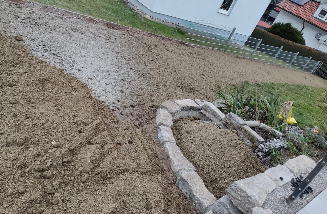 Beim Abriss der Wege und des Sonnendecks ist viel Stein übrig geblieben (Bild 1 und 4) und ich bringe es nicht über mich, den komplett entsorgen zu lassen. Ein Teil konnte schon wiederverwendet werden (in Bild 3 Mauer unten rechts und Beeteinfassung).