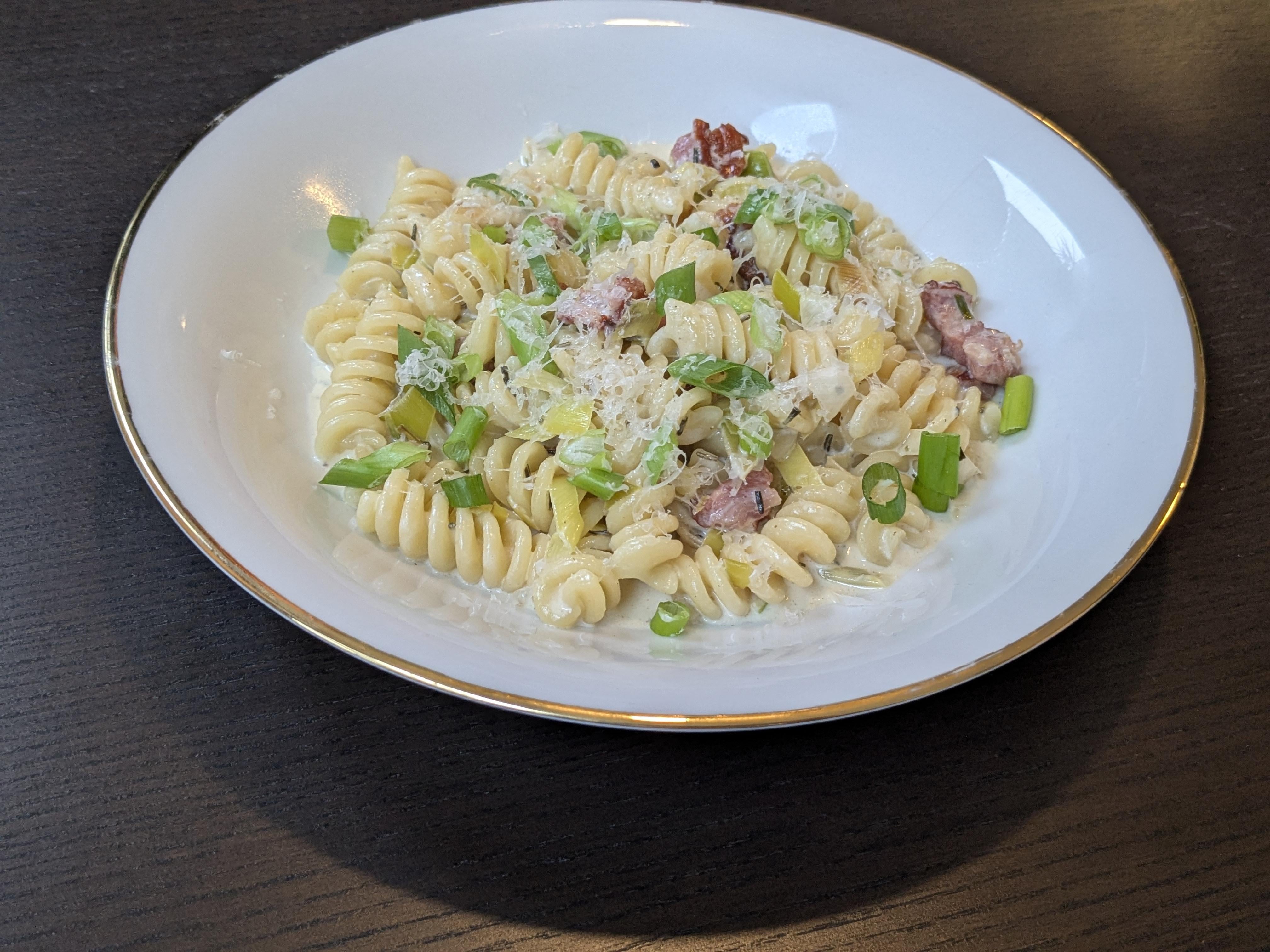 Speck auslassen und knusprig braten. Lauch und Frühlingszwiebeln dazu, etwa 2-4 Minuten. Knoblauch in feinen Scheiben dazu und wenn er anfängt zu duften, mit dem Weißwein ablöschen und verkochen lassen. Sahne, Muskat und Rosmarin hinzugeben und etwa 10 Minuten köcheln lassen. Im Anschluss den Frischkäse und etwas Parmesan in die Sauce und final abschmecken.