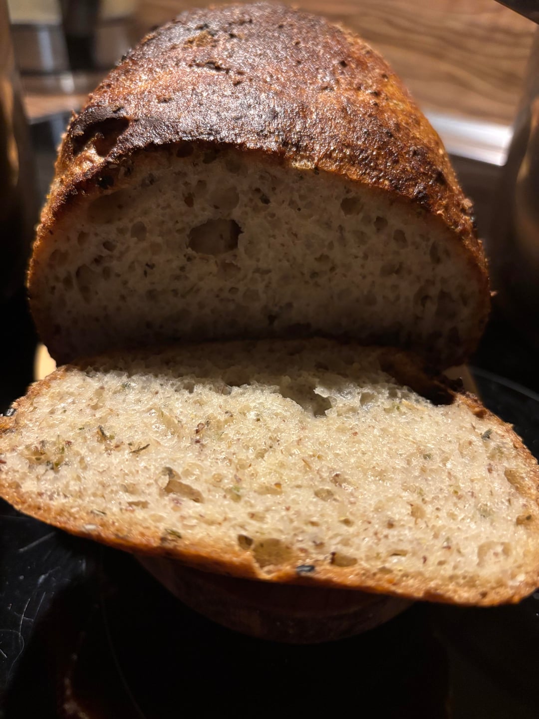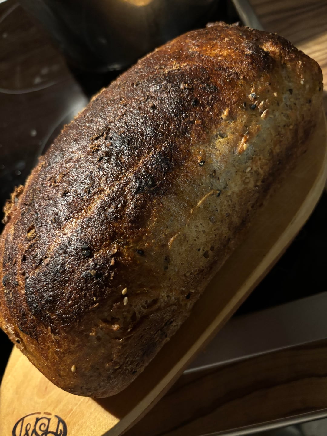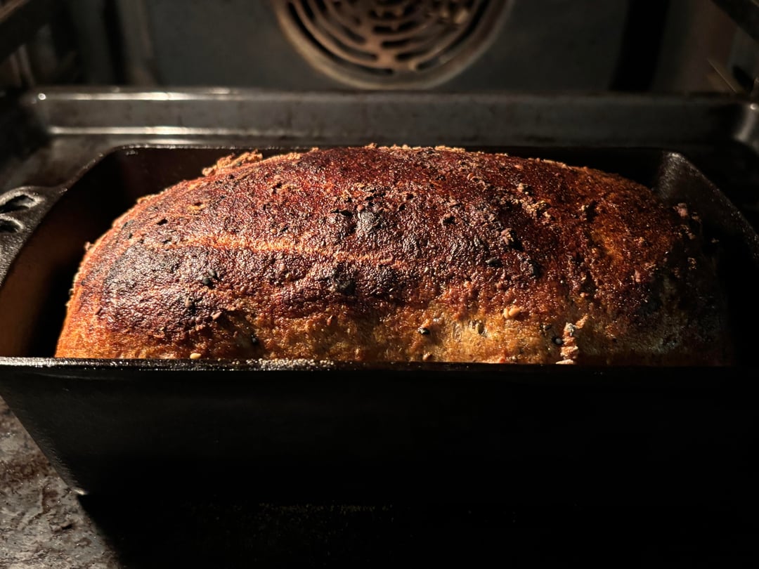 Man nehme eine Backform nach Wahl und buttert sie ein. Anschließend wird sie in den Ofen gepackt und bei 250 Grad Celsius Umluft erhitzt. Währenddessen nimmt man einen Brocken Teig, legt Sesam und Mehl auf ein Holzbrett und legt ihn aus bis er nicht mehr so arg feucht ist. Sollte die Butter im Ofen langsam anfangen zu blubbern, kommt der Teig rein, ein wenig Flüssigkeit in eine Schale, die unten im Ofen platziert wird und der Ofen wird wieder zugemacht. Das Brot braucht knapp eine halbe Stunde und muss dann noch abkühlen.