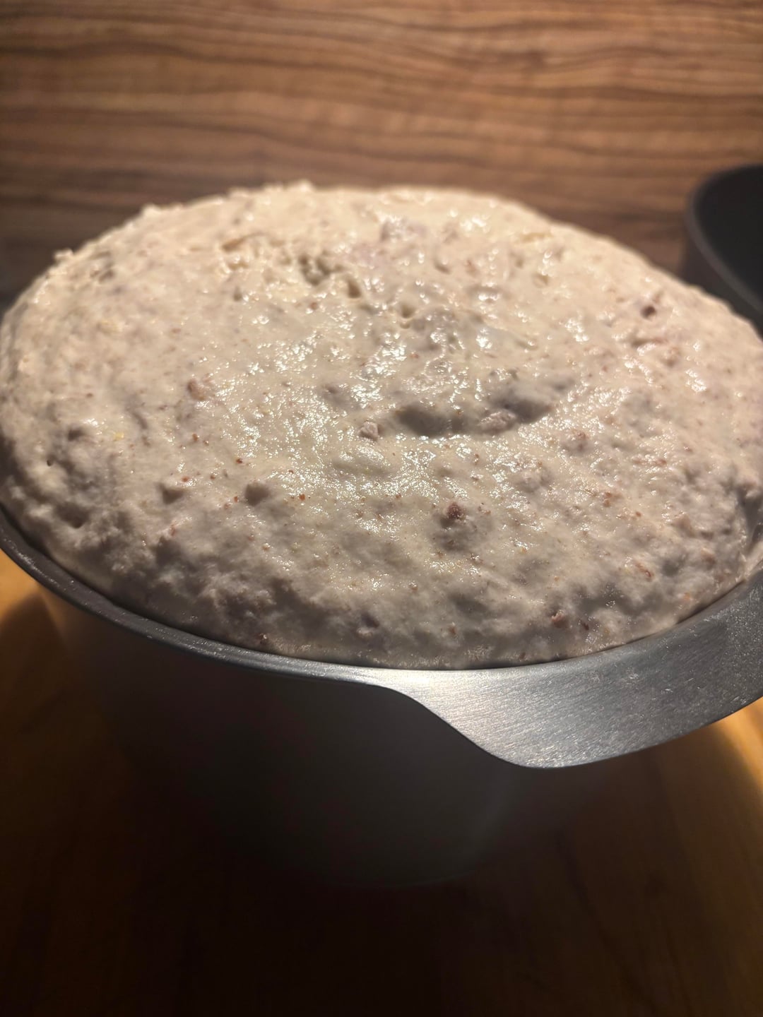 Alles außer Olivenöl und Wasser in eine große Schüssel tun und umrühren. Dann das Öl hinzugeben und Wasser langsam auch, während der Teig stark gerührt wird. Nach so 6 Minuten sollte er gut vermengt sein und feucht aussehen, aber keinen Flüssigkeitsfilm haben. Dann einfach draußen stehen lassen und nach knapp 6 Stunden müsste er hochgegangen sein.