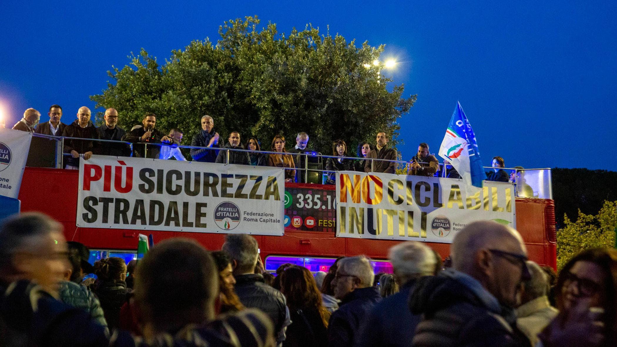 Die Parade gegen die verkehrsberuhigten Zonen und die nachhaltigen Mobilitätsprojekte des Kapitols kommt vor dem EUR-Sportpalast zum Stillstand: 300 Autos auf der Straße, zu viele für die Polizei. Slogan aus dem von den Meloniern gemieteten Doppeldeckerbus: „Lasst uns das Kapitol zurückerobern“
