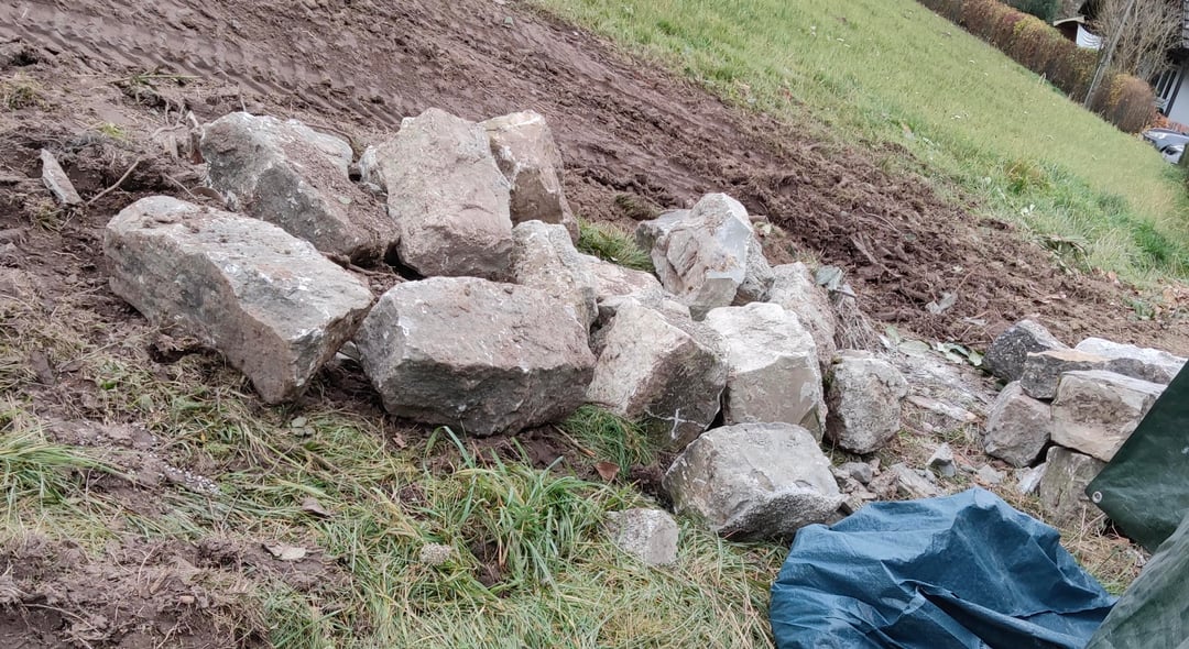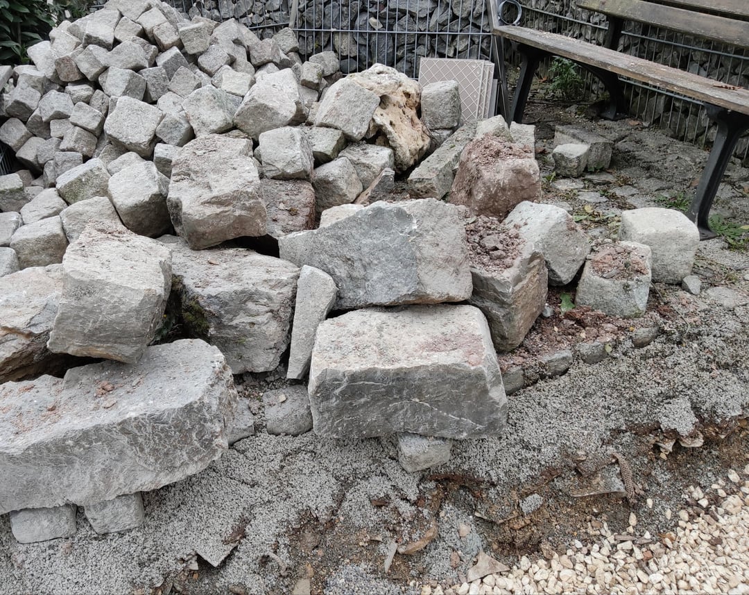 Beim Abriss der Wege und des Sonnendecks ist viel Stein übrig geblieben (Bild 1 und 4) und ich bringe es nicht über mich, den komplett entsorgen zu lassen. Ein Teil konnte schon wiederverwendet werden (in Bild 3 Mauer unten rechts und Beeteinfassung).
