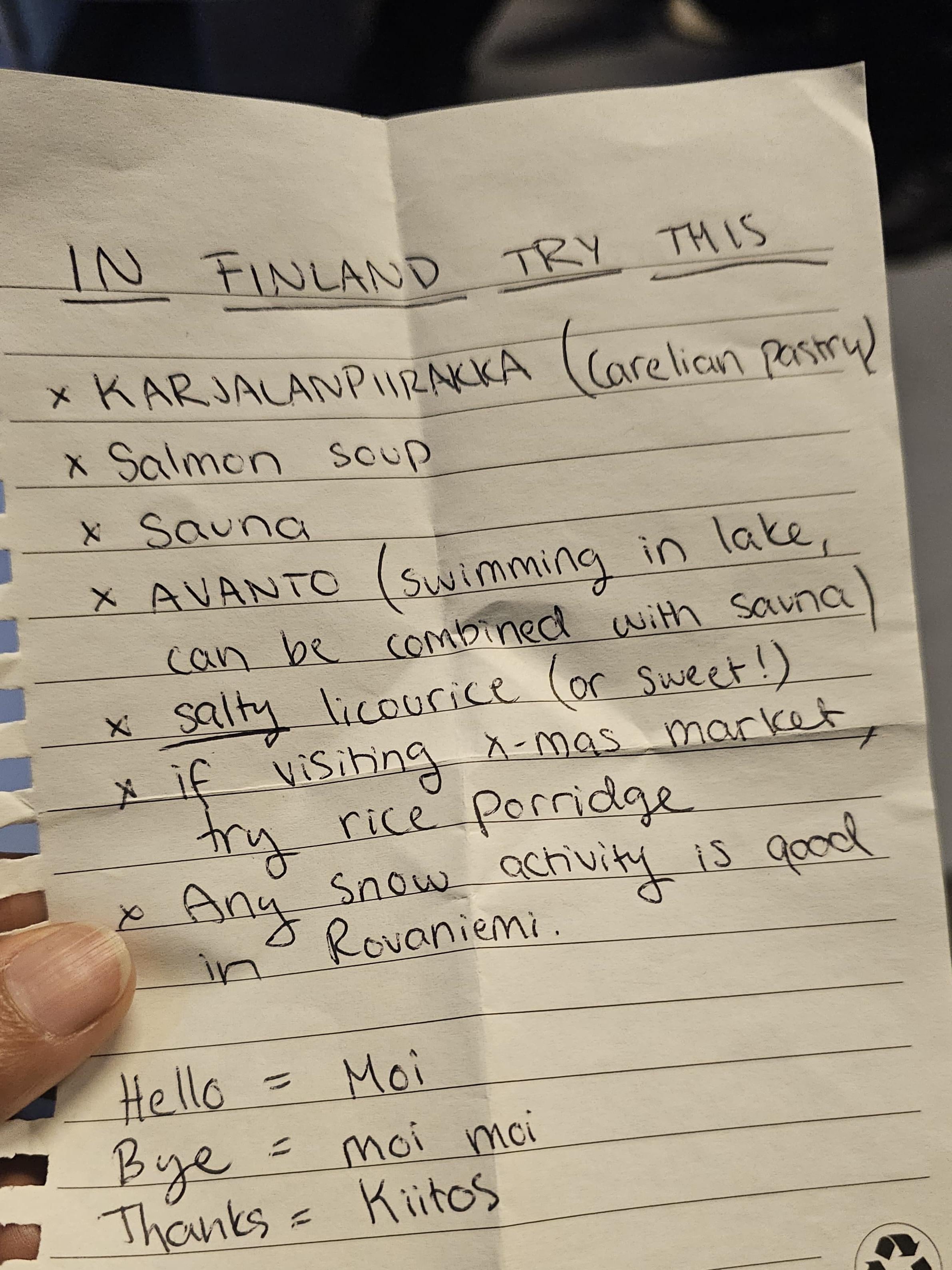 Ich starte gerade meine erste sechstägige Reise nach Finnland, und dank eines freundlichen finnischen Mädchens, das ich auf dem Flug kennengelernt habe, ist es bereits episch. Sie hat mir eine Reihe von Must-Dos mitgeteilt, die ich unbedingt ausprobieren möchte.