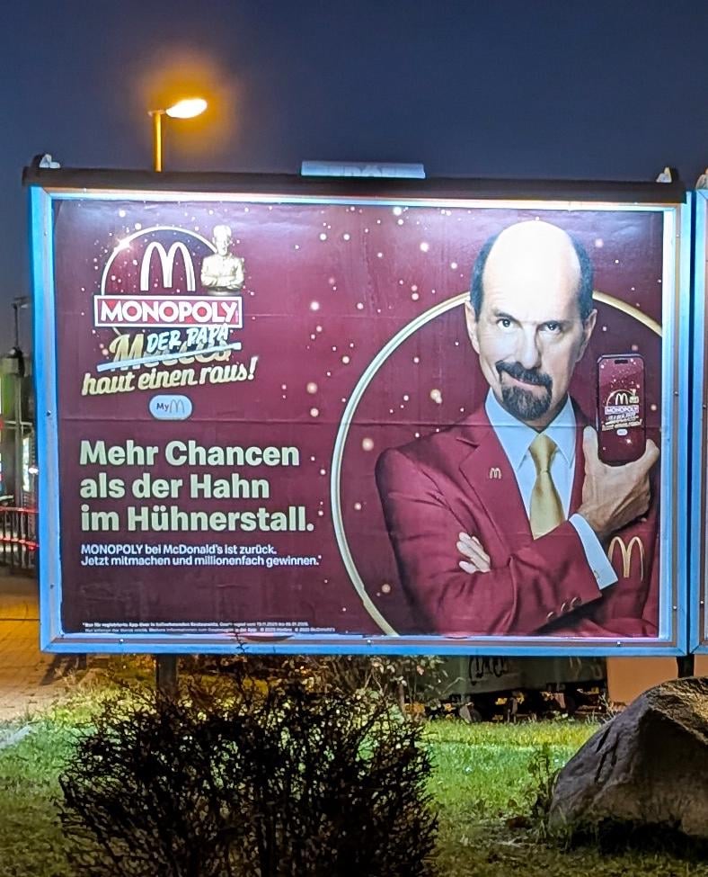 Den Slogan „Mehr Chancen als der Hahn im Hühnerstall“ im Kontext von McDonalds zu plakatieren, zeugt von bösartiger Ignoranz gegenüber der Realität der industriellen Massentierhaltung. Dass hier das systematische Leid von Lebewesen zu einer „witzigen“ Metapher für das Monopoly-Gewinnspiel trivialisiert wird, ist ethisch mal wieder ein Armutszeugnis. Es widert an, wie hier Massenkonsum und Tierleid mit der Illusion des schnellen Glücksspiel-Reichtums garniert werden. Ein weiteres Lehrbuchbeispiel für die perfide Normalisierung des Abartigen im Alltag.