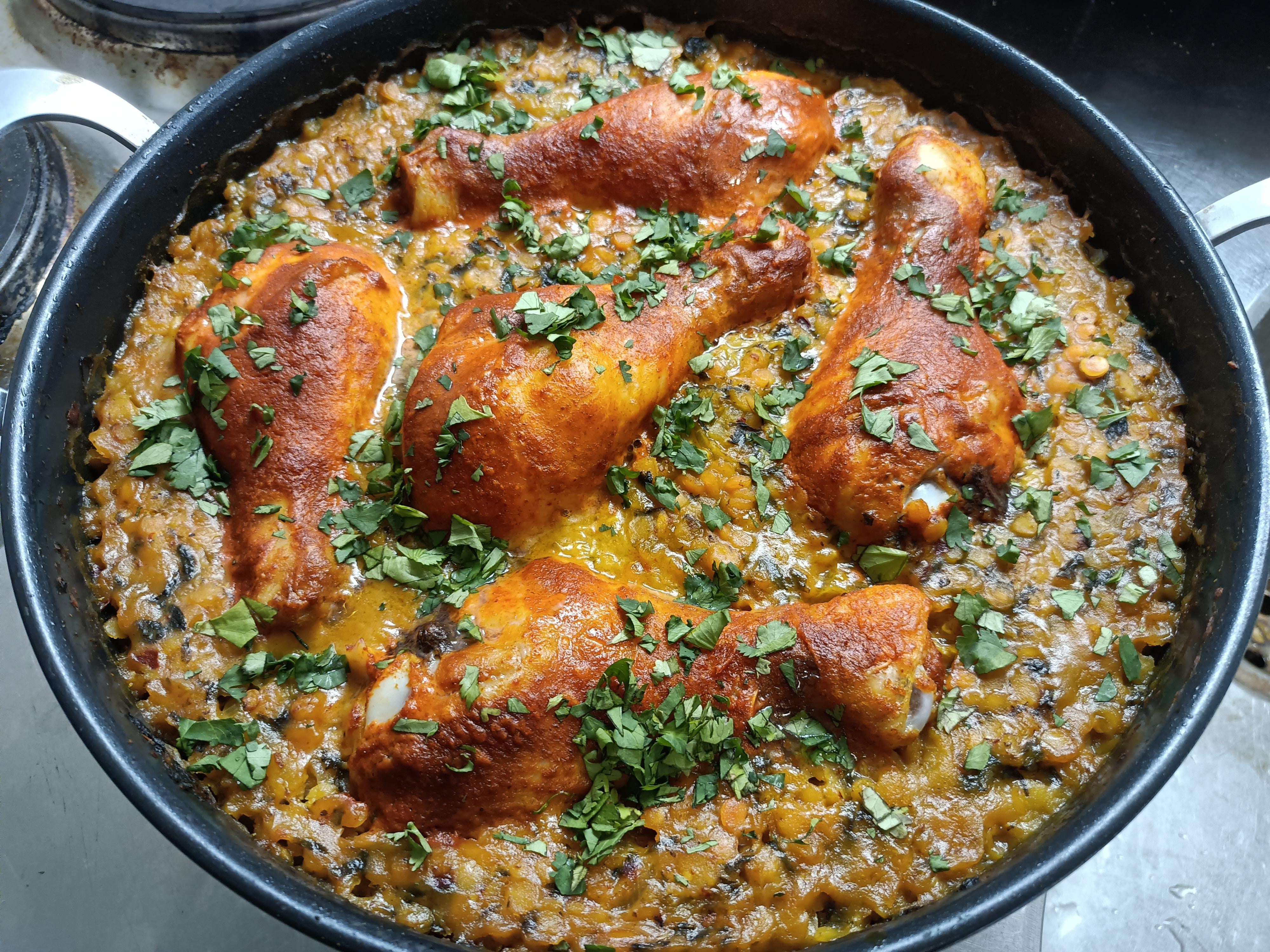 Die Hähnchenkeulen auf die Linsen legen, sobald diese bissfest sind, und ca. 40 Minuten im Ofen garen oder bis sie goldbraun sind. Mit Limettensaft und Koriander garnieren.