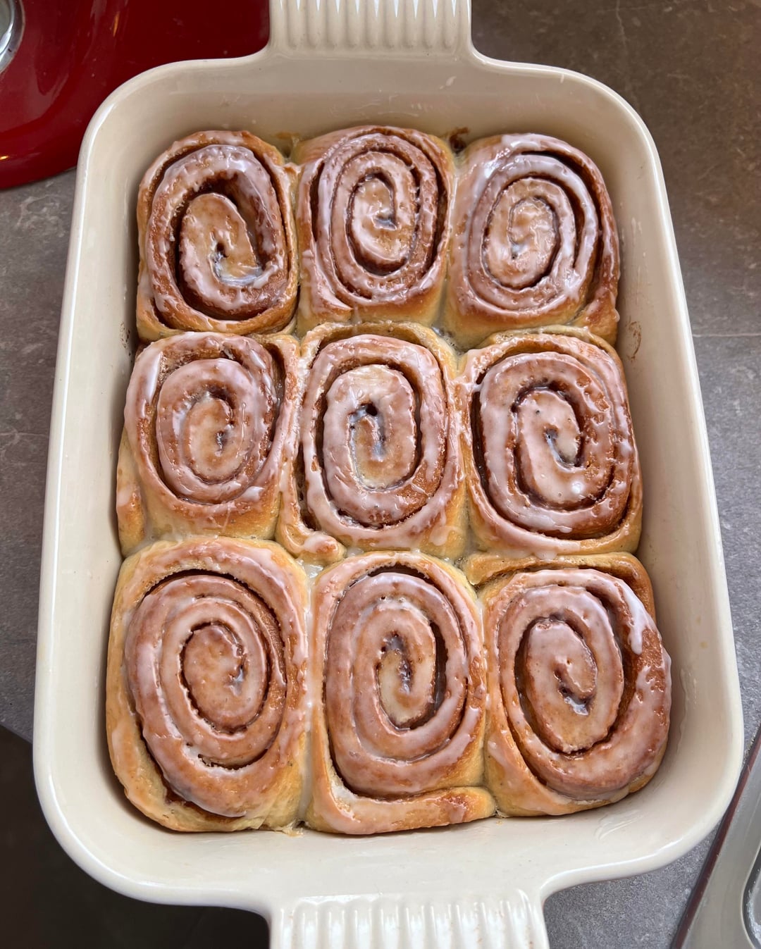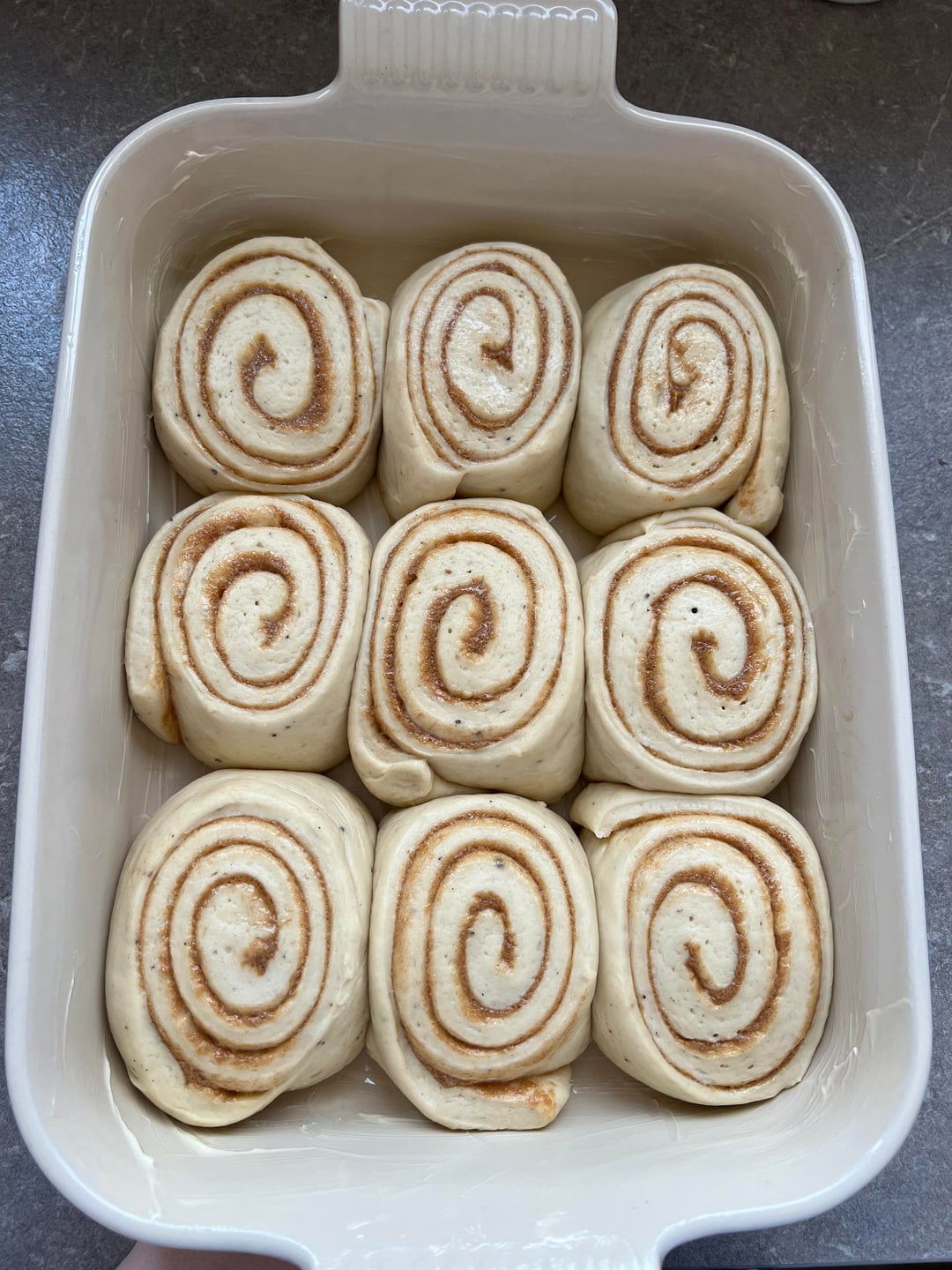 Nach meinem Lieblingsrezept: https://josemola.de/rezepte/zimtschnecken/ allerdings ohne Frischkäsefrosting, weil ich das nicht mag, und gewürzt mit Cardamom im Teig und schwarzem Pfeffer in der Füllung (Nein, man schmeckt den Pfeffer nicht wirklich raus, die Füllung schmeckt nur würziger und zimtiger).