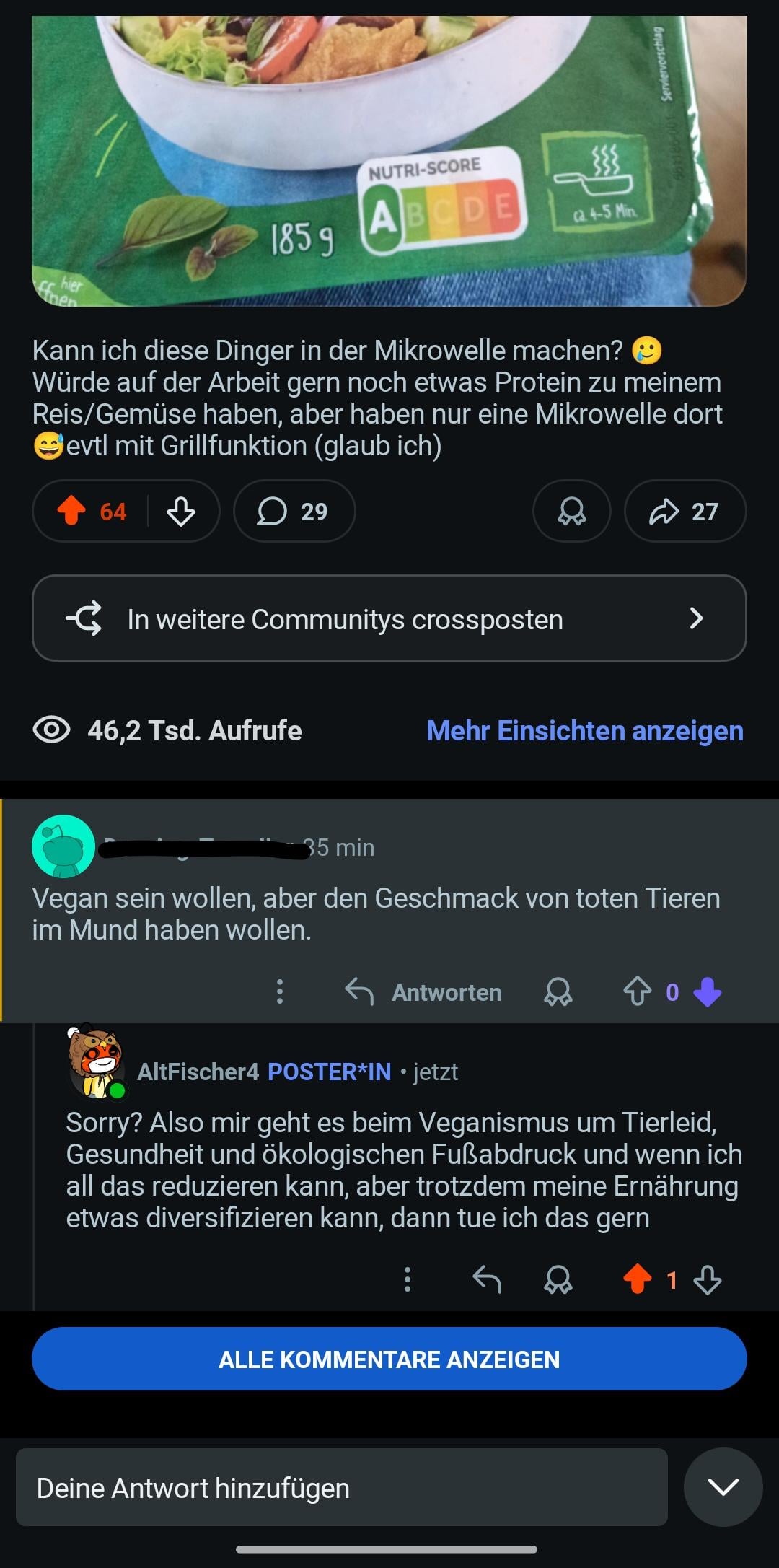 In meinem Post ging es um vegane Chunks von Vemondo vor 3 Tagen und jetzt kam dieser Kommentar reingeflattert. Die Person hat auch bei anderen hier so reagiert, die Ersatzprodukte posten…