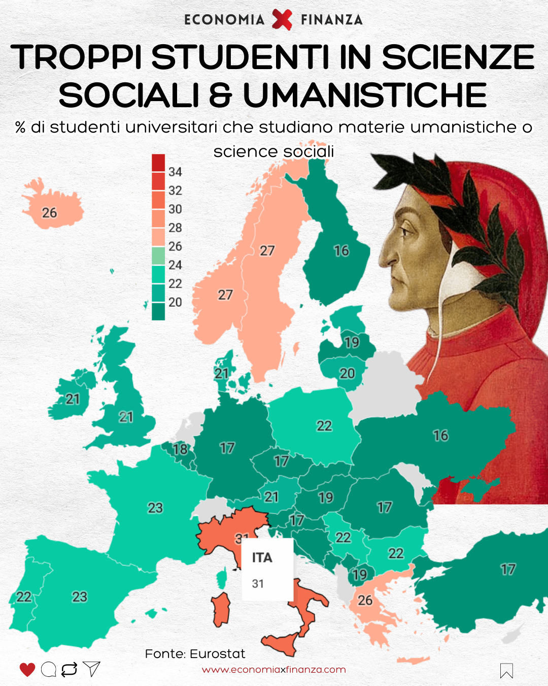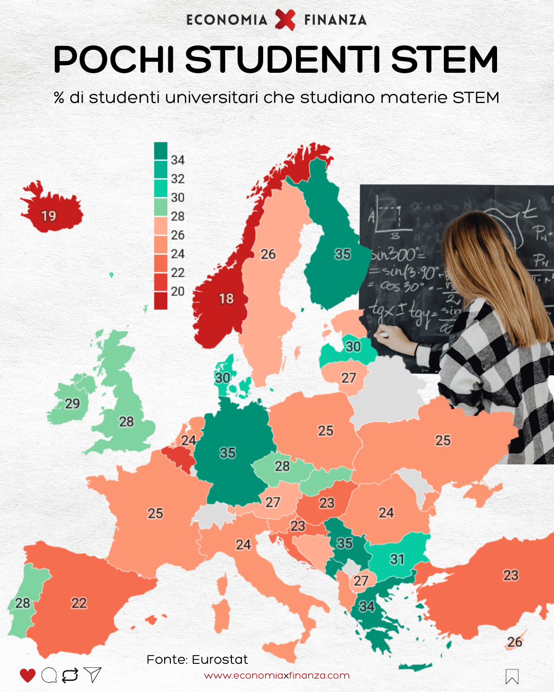 Perché accorpiamo le scienze sociali con le materie umanistiche? Falsa il grafico. Perché è definito come „poco“, in relazione a chi studia materie STEM, se letteralmente moltissimi paesi europei, perlomeno secondo questo grafico, condividono simili percentuali? Anche negli stati uniti i laureati stem dovrebbero essere sul 20 e qualcosa %, verso il basso.