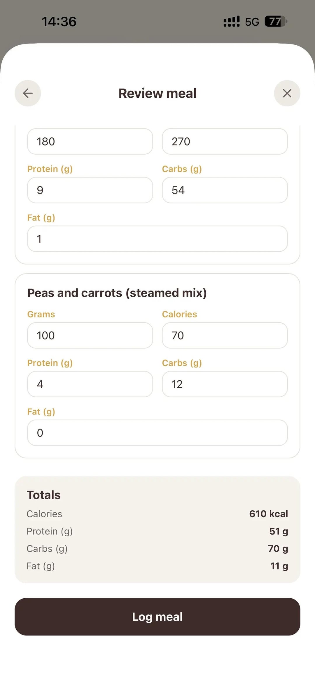 Eine der Funktionen, die ich hinzugefügt habe, war die Möglichkeit, ein Foto von bereits gekochten Speisen in ihren jeweiligen Pfannen zu machen und die App aufzufordern, mir die Grammmenge anzugeben, die ich von jeder gekochten Speise benötige, um beispielsweise 500 Kalorien und 30 g Protein zu erreichen. Das hat wirklich geholfen, meine Diät einzuhalten.
