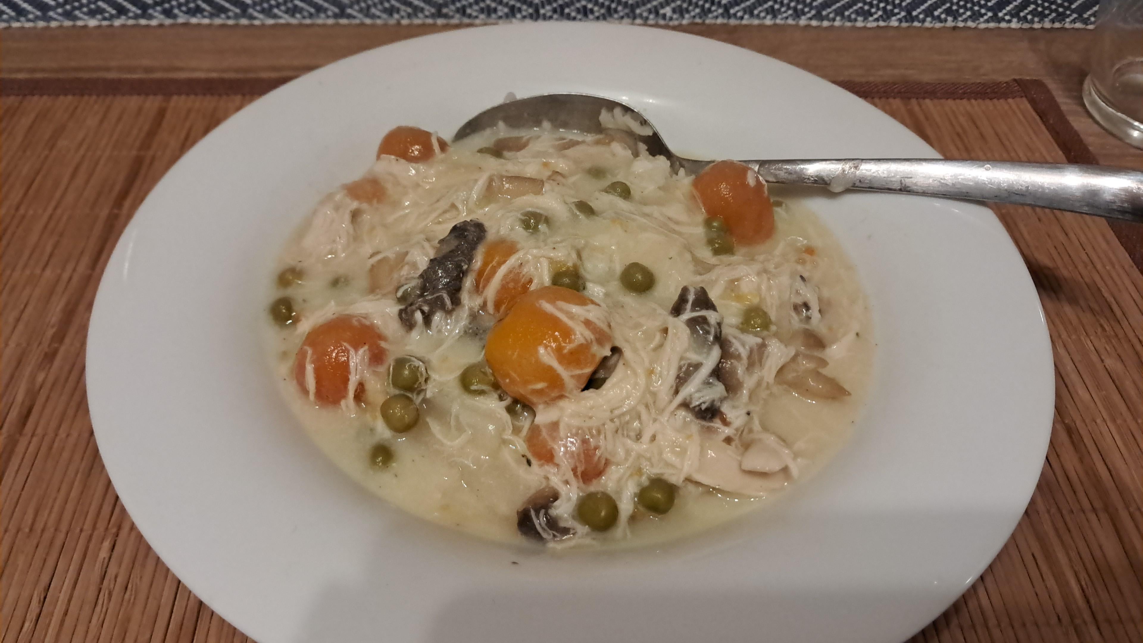 Gekochtes Hühnerfleisch(z.B. Reste aus Hühnersuppe), Erbsen & Möhren (1 Dose), 1 Dose Champignons, 1 Glas Spargel, Butter, Sahne 200ml, Hühnerbrühe (ca. 750 ml), Salz, Pfeffer, Zitronensaft, Mehl, 2 Eigelb
