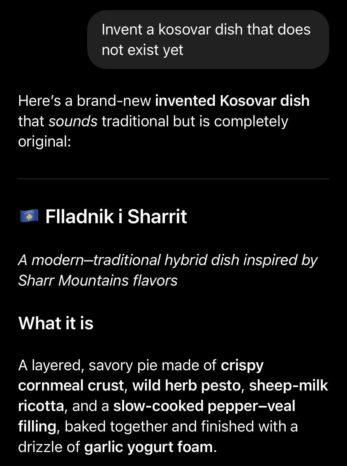 Ich habe ChatGPT gebeten, ein kosovarisches Gericht zu erfinden, das es noch nicht gibt, und das ist dabei herausgekommen