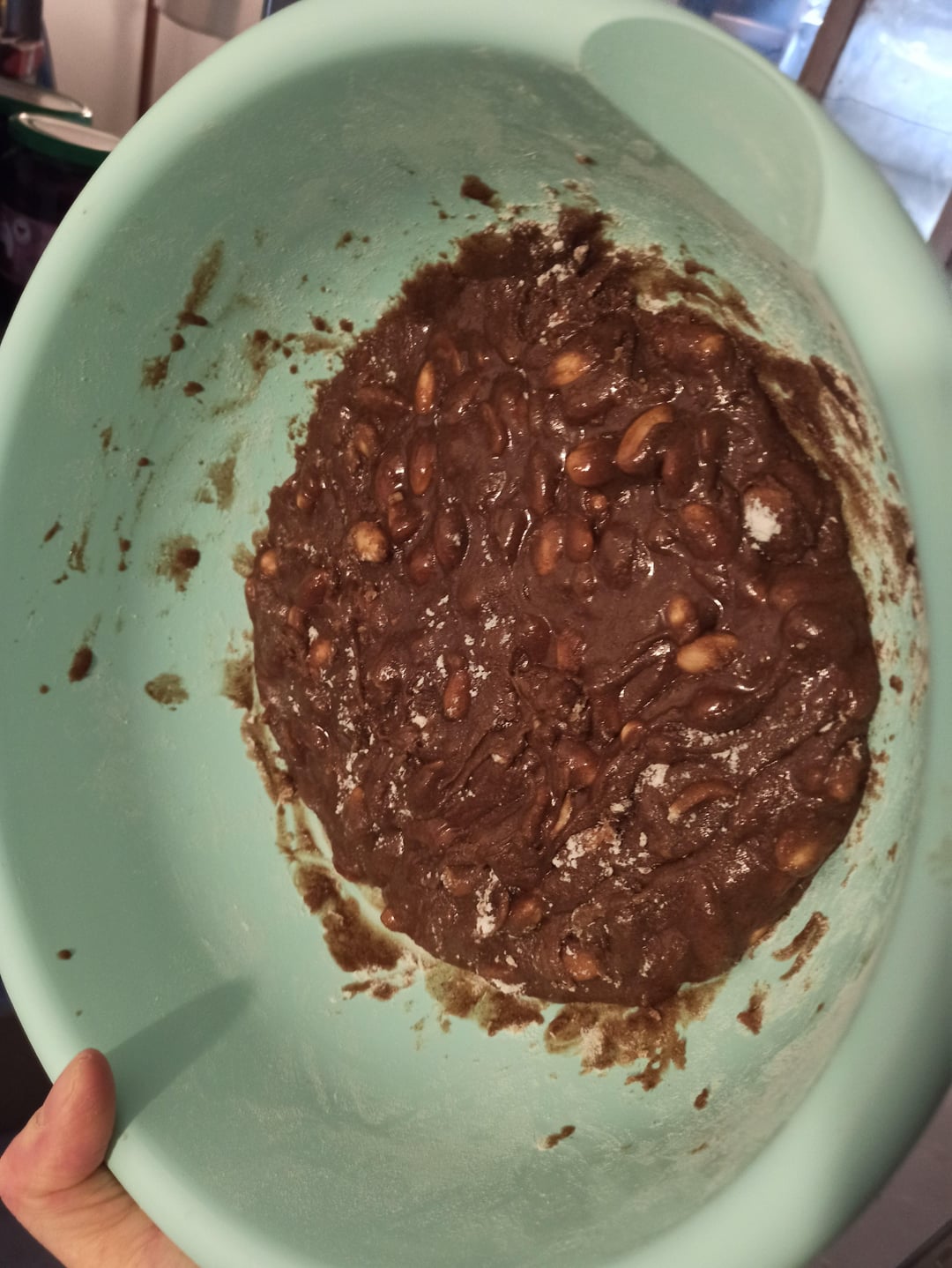 Was dabei rausgekommen ist, ist ein total klebriger Teig der sehr fest ist. Quasi nur eingedickter Honig mit Mandelklunkern drin. Hat jemand Erfahrung und kann mir sagen, ob das so gewollt ist, bzw was ich falsch gemacht habe? Mich verwirrt die Zeile "der Teig darf nur locker sein" sowie "Mehl wird daruntergeworfen"…