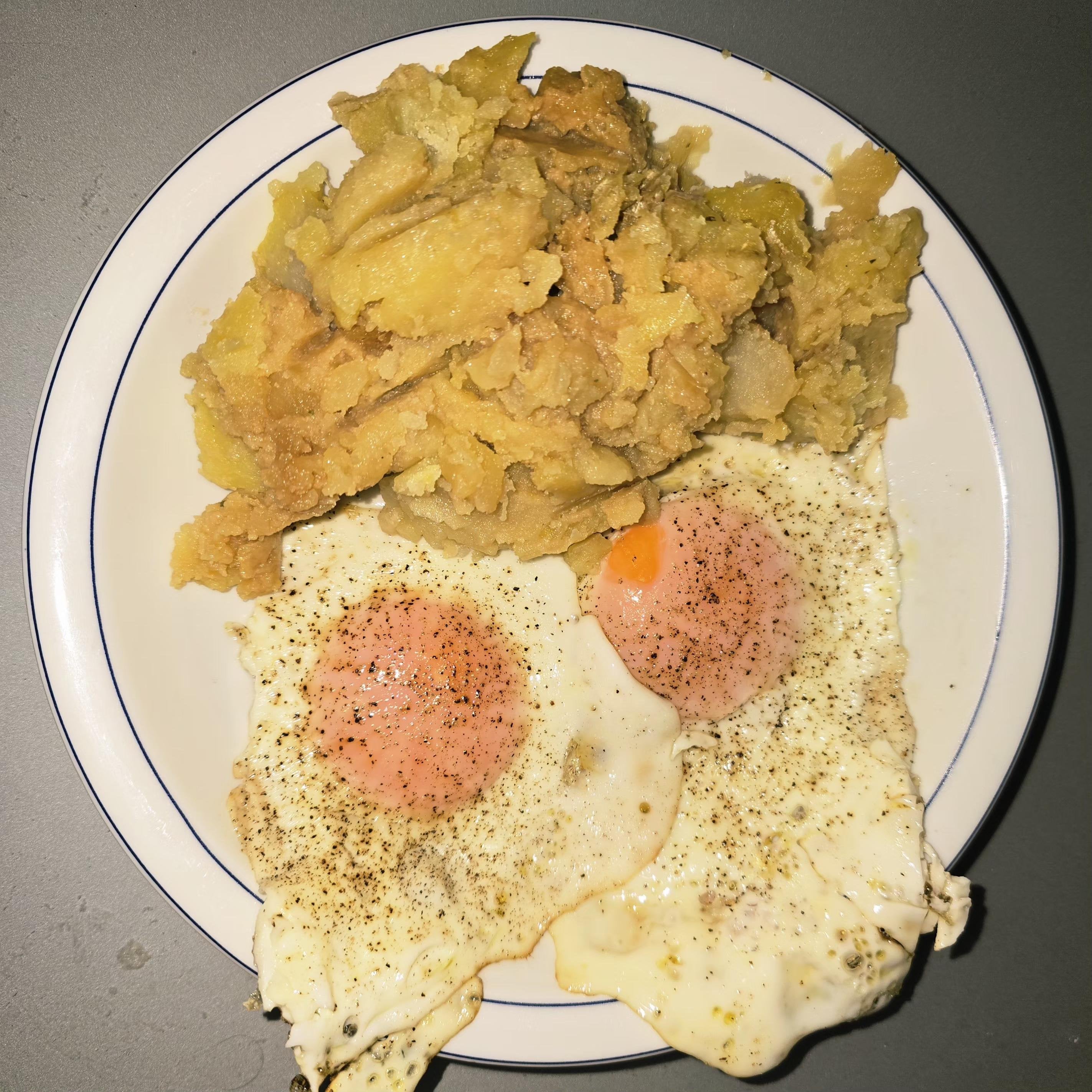Das Gericht kann auch vorgekocht und am nächsten Tag aufgewärmt werden, so dass man nur noch die Eier braten muss. Eignet sich hervorragend für stressige Tage ohne Zeit für das Kochen.