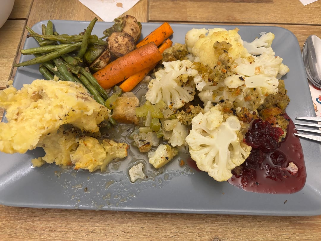 Alles ist vegan. Auf dem Teller sieht es nicht so schick aus aber es hat richtig gut geschmeckt.