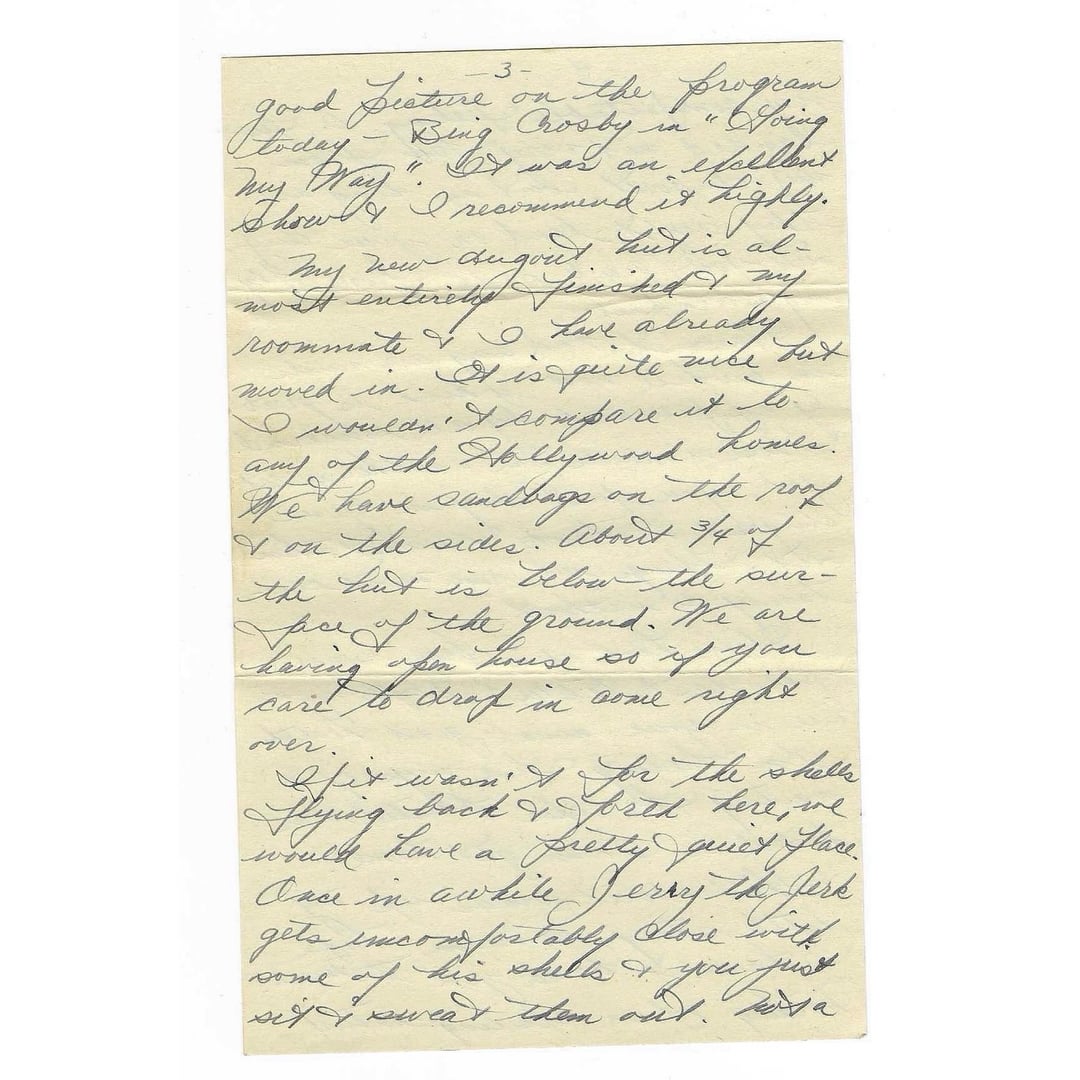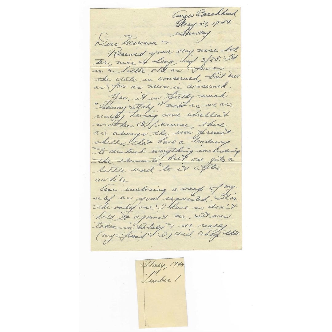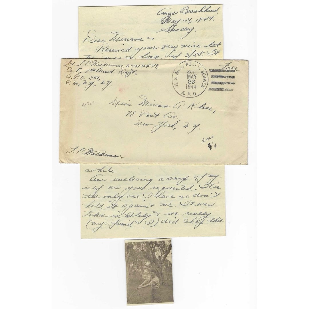 This letter was written by Theodore C Walderman. He was born in 1917. During the war he served with the 1st Armored Regiment, 1st Armored Division. At the time of writing this letter, Theodore and his unit were holding their positions on the Anzio Beachhead in Italy, living in dugouts under constant German artillery fire as they waited for the long anticipated Allied breakout that would begin just days later.