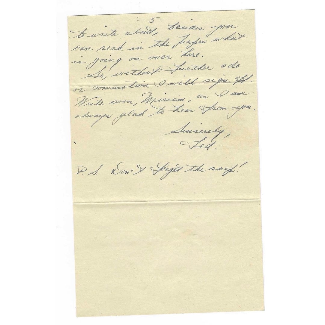 >That about winds up my little story, Miriam, hope I haven’t bored you too much. Nothing of an exciting nature to write about, besides you can read in the paper what is going on over here.