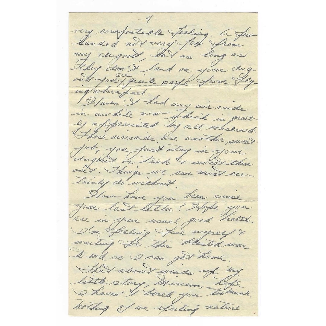 >How have you been since your last letter? Hope you are in your usual good health. I’m feeling fine myself and waiting for this blasted war to end so I can get home.