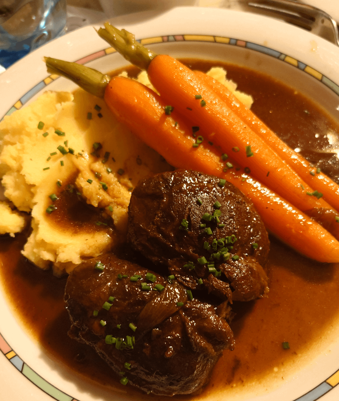 Schweinebäckchen in Guinnesssauce mit glasierten Möhrchen und Kartoffelpüree