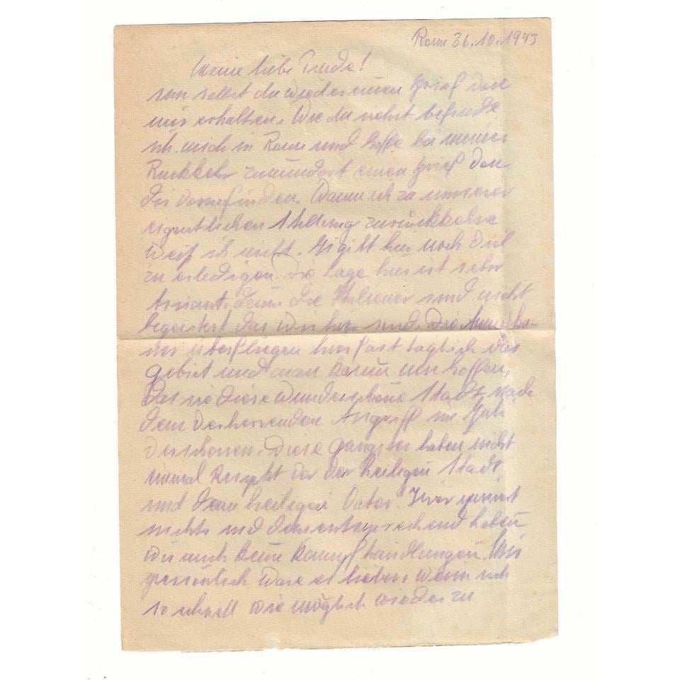 >Now you are to receive another letter from me. As you can see, I am in Rome and hope to find at least one letter from you when I return. When I will return to our actual position I do not know. There is still much to do here. The situation here is very explosive, because the Italians are not thrilled that we are here. The Americans fly over here almost daily and one can only hope that they will spare this beautiful city after the devastating attack in July. These gangsters do not even have respect for the Holy City and the Holy Father.