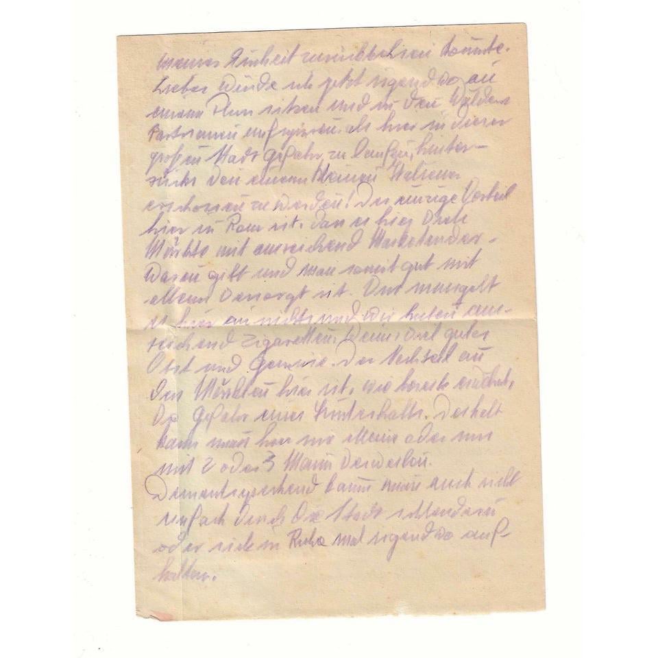 >Nothing is happening here and accordingly we have no fighting. Personally, I would prefer to return to my unit as soon as possible. I would rather sit by a river somewhere and track down partisans in the woods than run the risk of being shot in the back by a little Italian here in this big city. The only advantage here in Rome is that there are many markets with enough market goods and you are thus well supplied with everything. We lack nothing here and have enough cigarettes, wine, plenty of good fruit and vegetables. The downside to the markets here, as mentioned earlier, is the risk of ambush. Therefore, you can never stay here alone or only with 2 or 3 men.