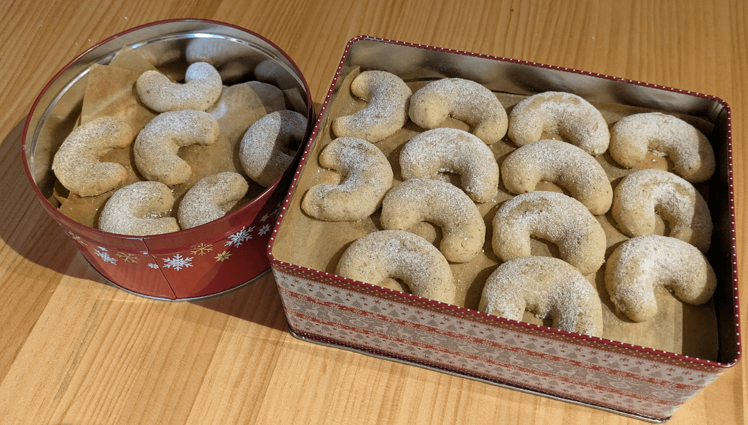 Einzige Änderung ist, dass ich nach 2-3 Minuten abkühlen mit einem Sieb eine Mischung aus Puderzucker und Vanillezucker (1:1) auf die Kipferl streue.