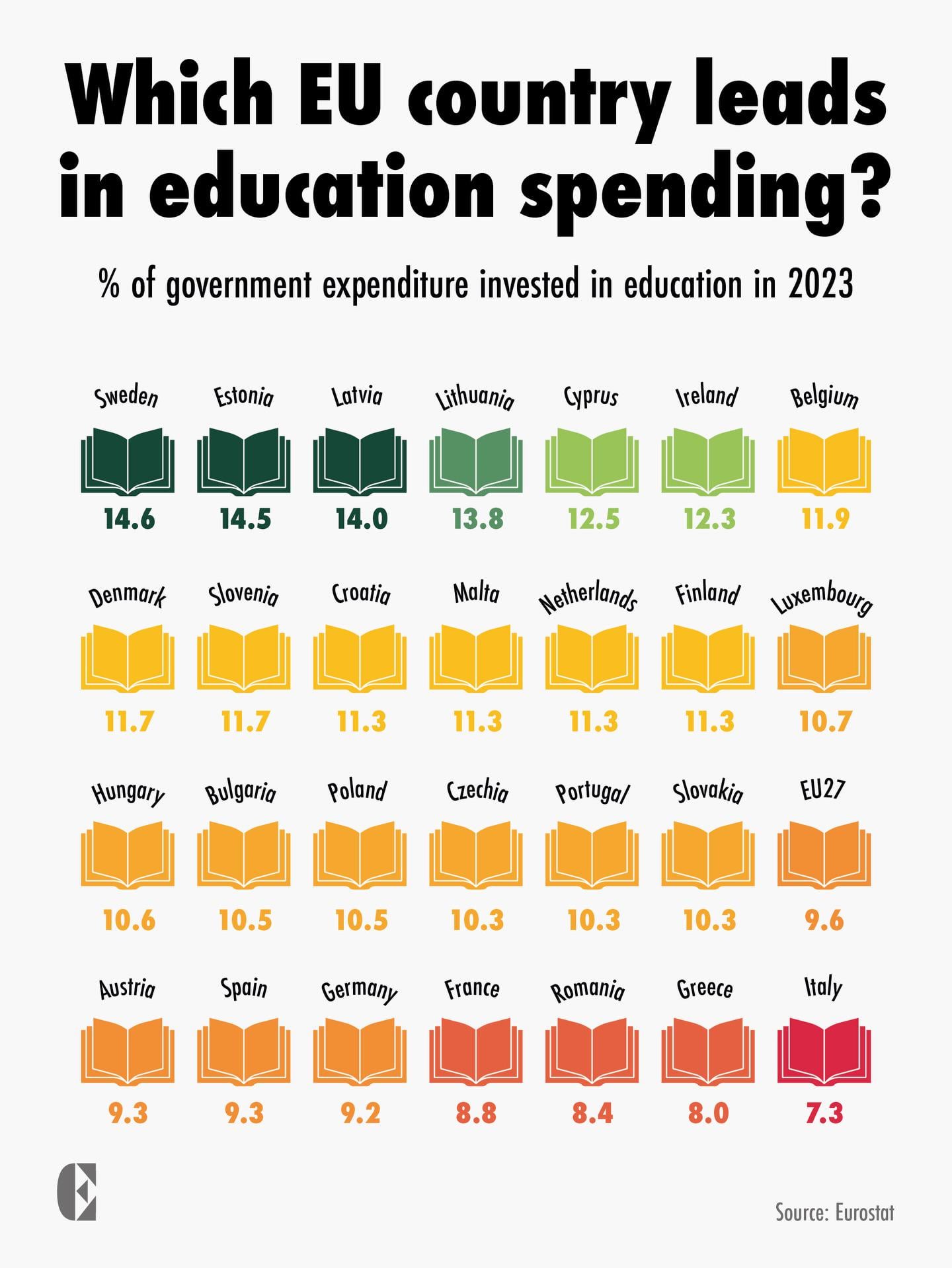 > As a share of total expenditure at the level of the EU, general government expenditure on ‘education’ amounted to 9.6% in 2023. At country level, in 2023, for Sweden and Estonia (both at 14.5%), Latvia (14.0%), Lithuania (13.8%), Cyprus (12.5%), Ireland (12.3%), Belgium (11.9%) and as well as Switzerland (16.9%) and Iceland (14.8%) among EFTA countries, ‘education’ expenditure accounted for relatively high shares of general government total expenditure. The lowest shares of ‘education’ expenditure in total expenditure were observed for Italy (7.3%), Greece (8.0%), Romania (8.2%) and France.