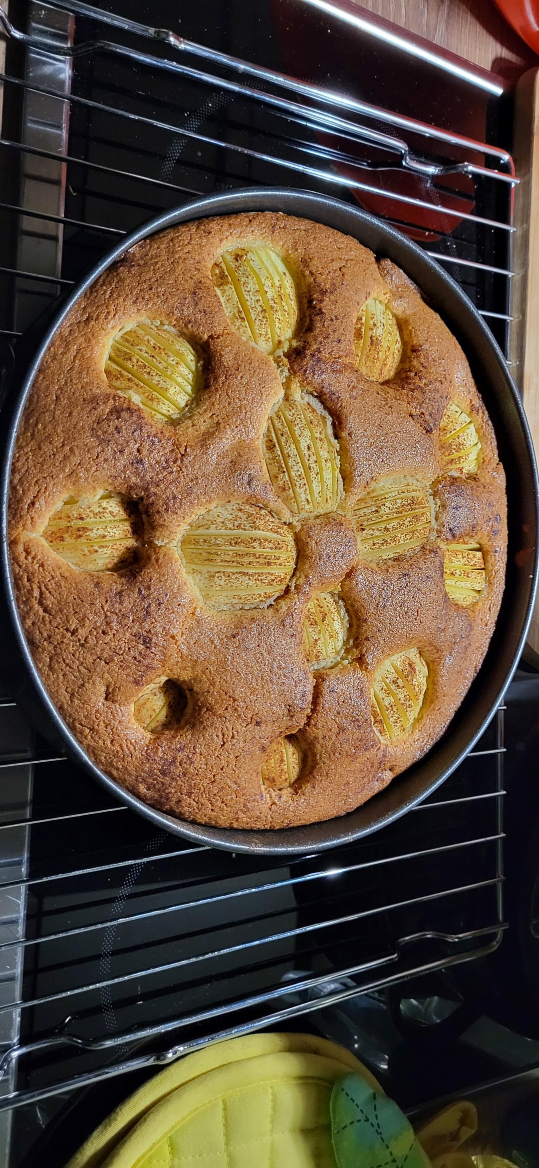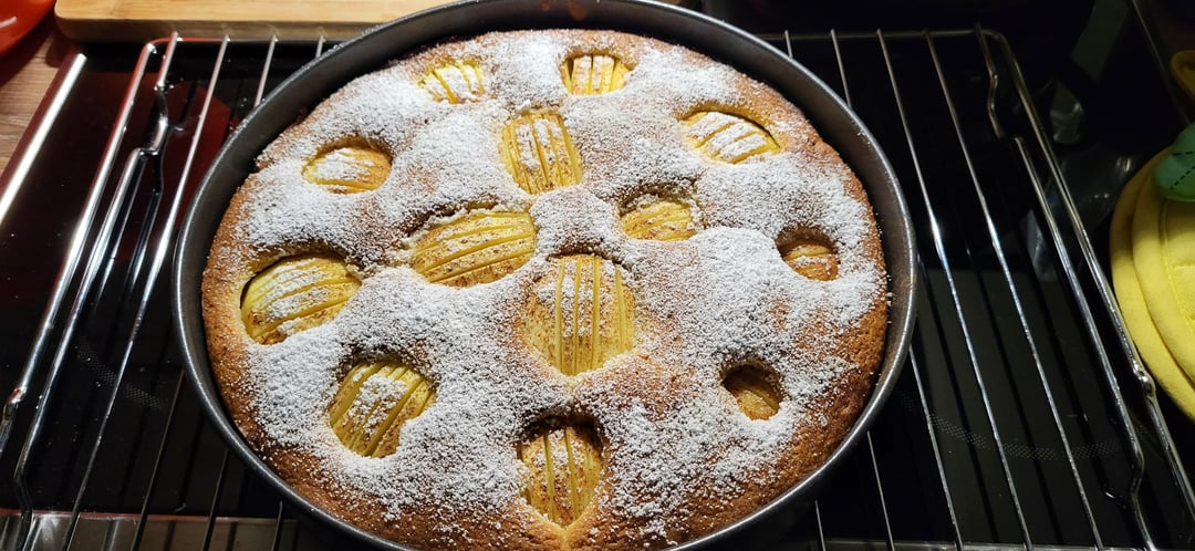 Im Prinzip ein normaler Rührteig, also Butter und Zucker schaumig schlagen, Eier drunter, mit dem ganzen Trockengedöns zusammenrühren kann nach Gusto bisschen Milch und Öl bei damit nicht so trocken. Wenn Teig fertig das Rohmarzipan in Stückchen gezupft und unter den Teig. Alles in Springform, Äpfel reindrücken. Fertig.