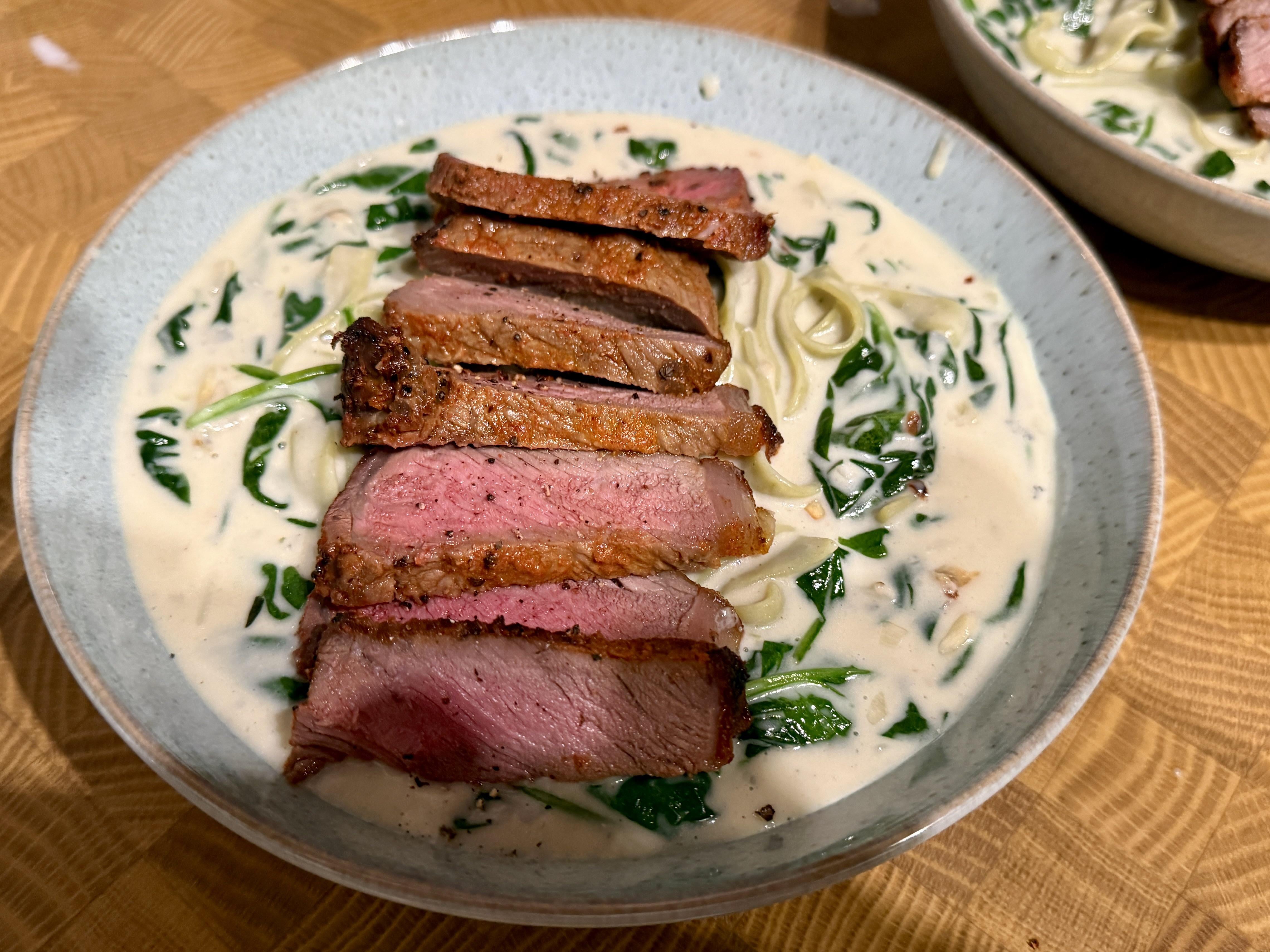 Mit Tagliatelle und Medium gebratenem Steak servieren.