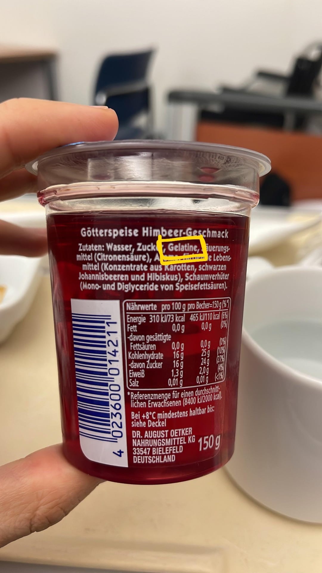 Die Nummer mit der Götterspeise brachten sie jedoch nicht, fragten mich aber, ob ich gerne welche hätte. Wenn diese keine Gelatine enthielte, nähme ich sie gerne. Aber bitte nur dann. Ich bekam keine. Aber naja, wenigstens hat man mich gefragt…