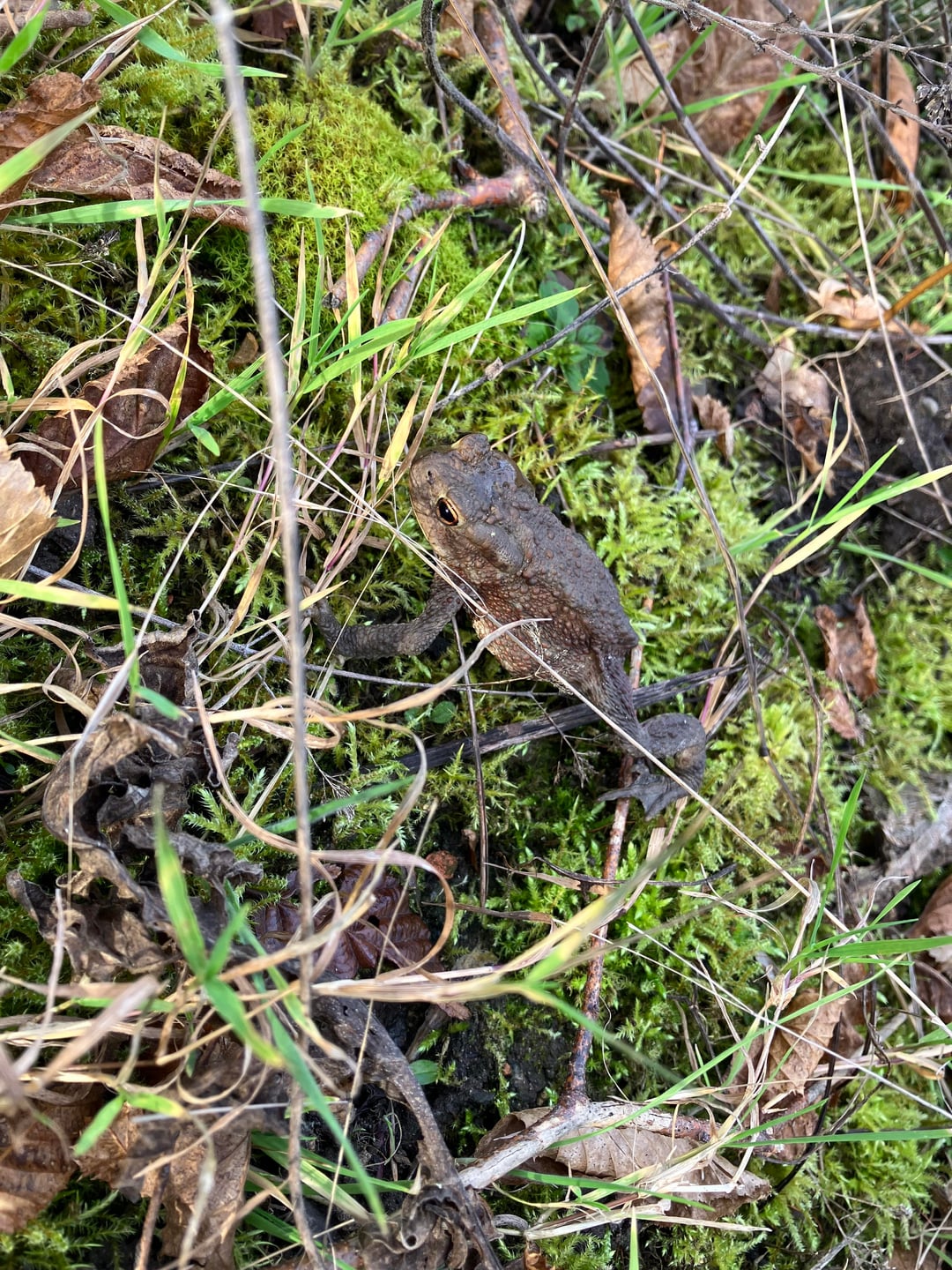 Das eine junge Erdkröte. Erdkröten sind im Garten gerne gesehen, weil sie Schädlinge wie Schnecken und Raupen fressen.