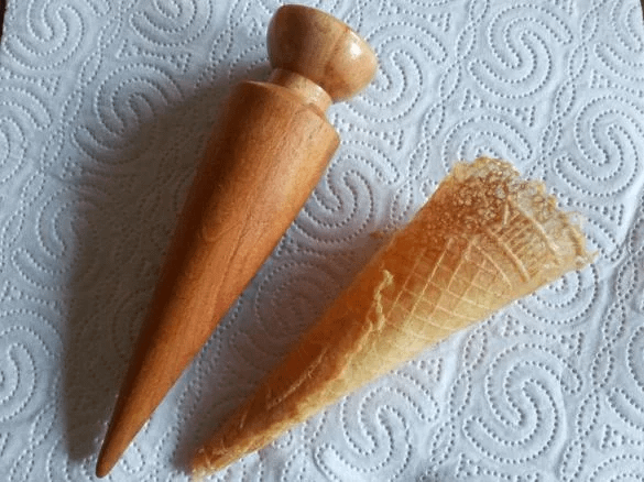 Im Ernst: Man hat den Dreh schnell raus und schnell muss man auch sein, da die Waffeln sich nur sehr heiß rollen lassen. Ihr könnt entweder die klassische zylindrische Rolle oder – wenn Ihr ein Rollholz wie im Foto verwendet – mehr kegelförmig rollen.